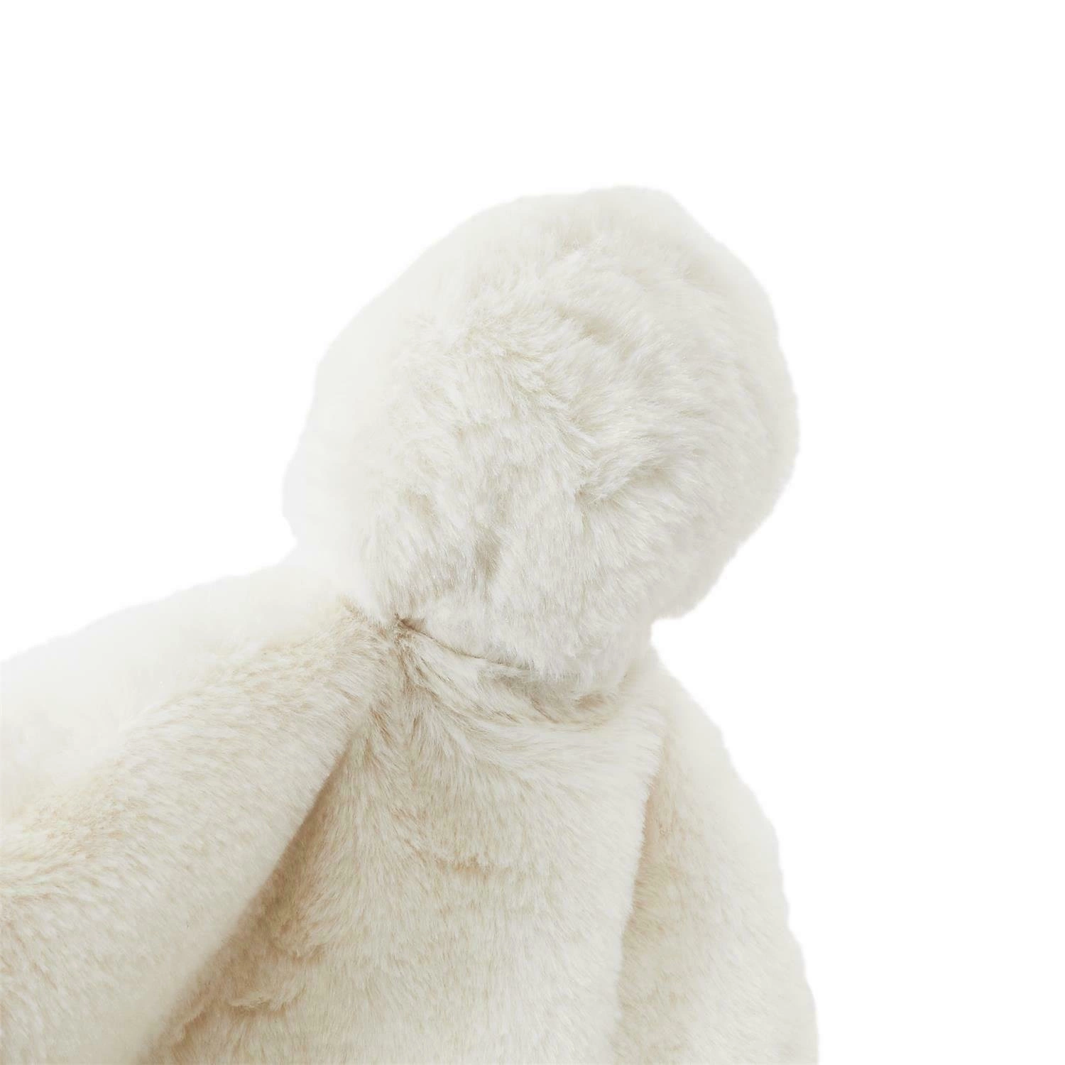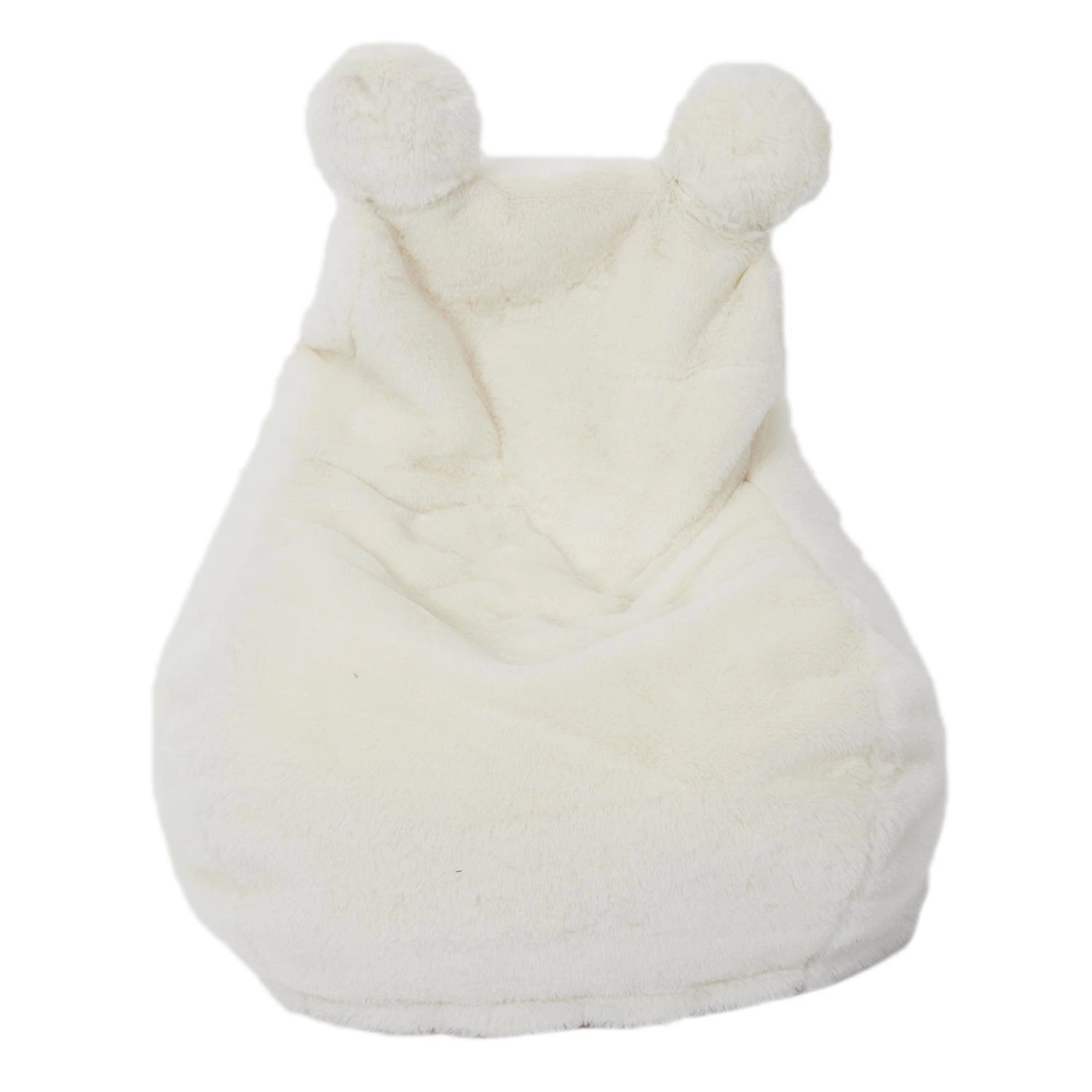 - Pufa wykonana jest z przyjemnego w dotyku materiału przypominającego futro i została ozdobiona dwoma białymi pomponami, które wyglądają jak uszy misia.