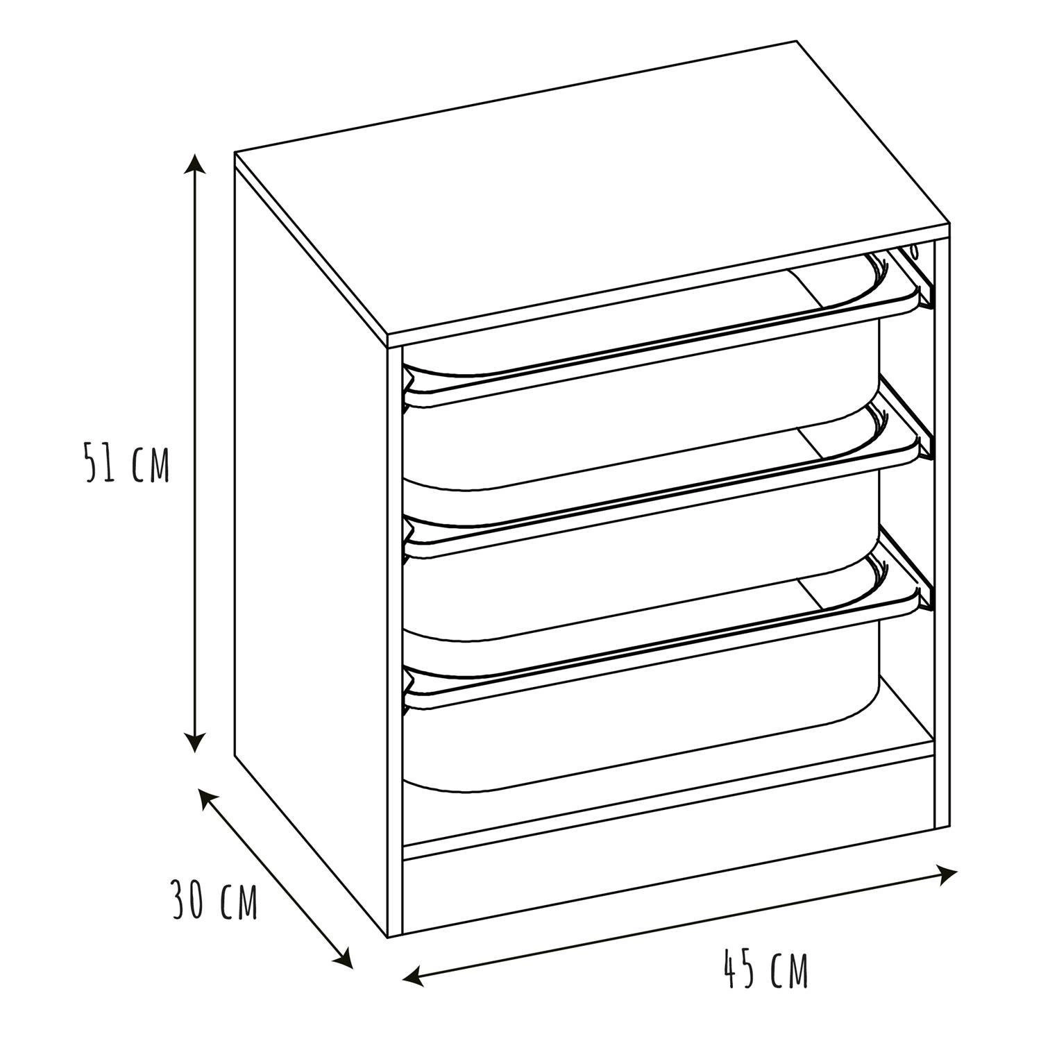 Ten dziecięcy regał do przechowywania z 3 pojemnikami wykonany jest z płyty meblowej i jest łatwy do przenoszenia. Pozwoli Ci i twojemu dziecku zachować porządek w pokoju. Elmo S jest estetyczny, szczególnie wkomponuje się w jasne wnętrza.