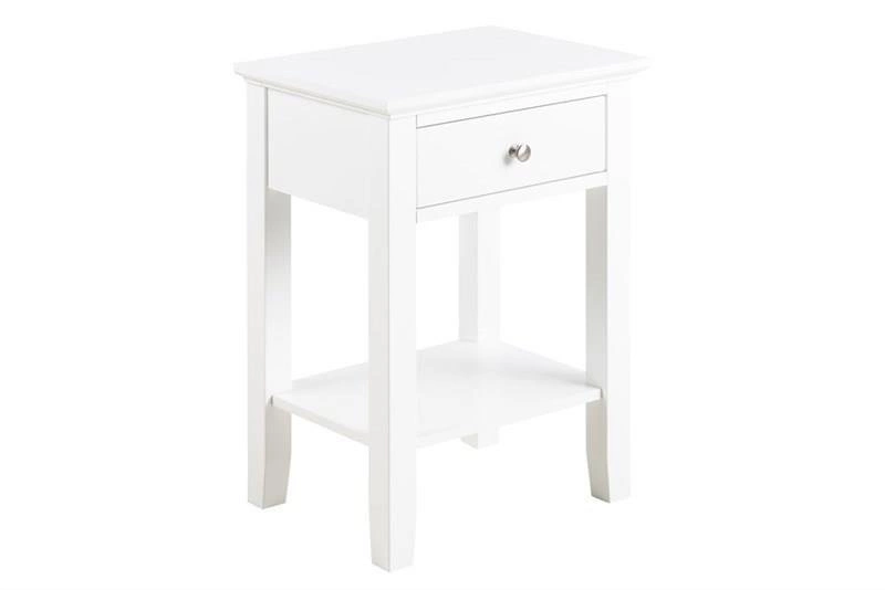 Szafka nocna Linnea wykonana została z płyty MDF pomalowanej na kolor biały. Posiada 1 szufladę, która pomieści wszystkie niezbędne rzeczy takie jak książka, okulary czy telefon. Szafka nocna wykończona została w prostym, klasycznym stylu dzięki czemu wtopi się doskonale w każde wnętrze.