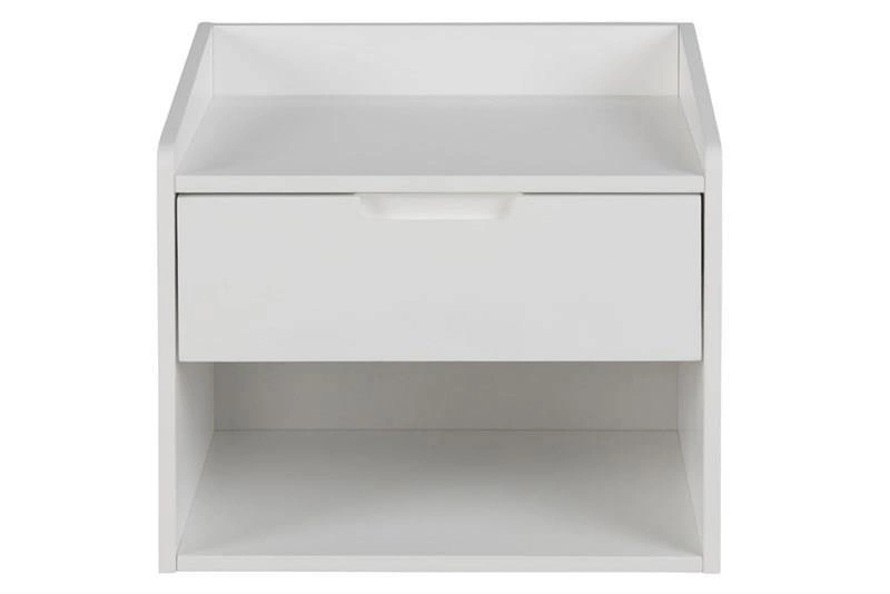Szafka nocna Dimeo wykonana została z pyty MDF w wykończeniu lakierowanym w kolorze białym. Szafka posiada jedną szufladę, która pomieści niezbędne drobiazgi. Szafka Dimeo może zostać również zawieszona na ścianie obok łóżka.