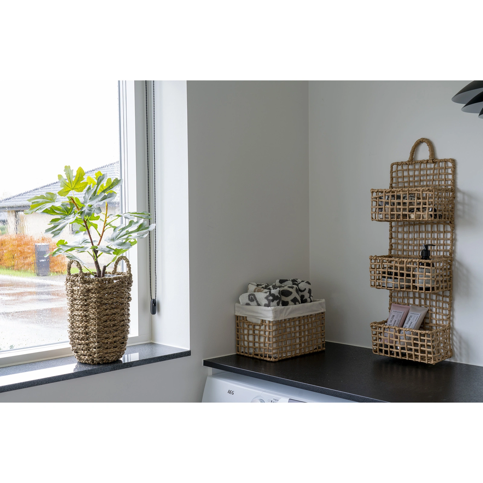 - Sznurek papierowy na stalowej konstrukcji – otrzymujesz lekki, a zarazem stabilny kosz dekoracyjny, który dobrze trzyma formę.