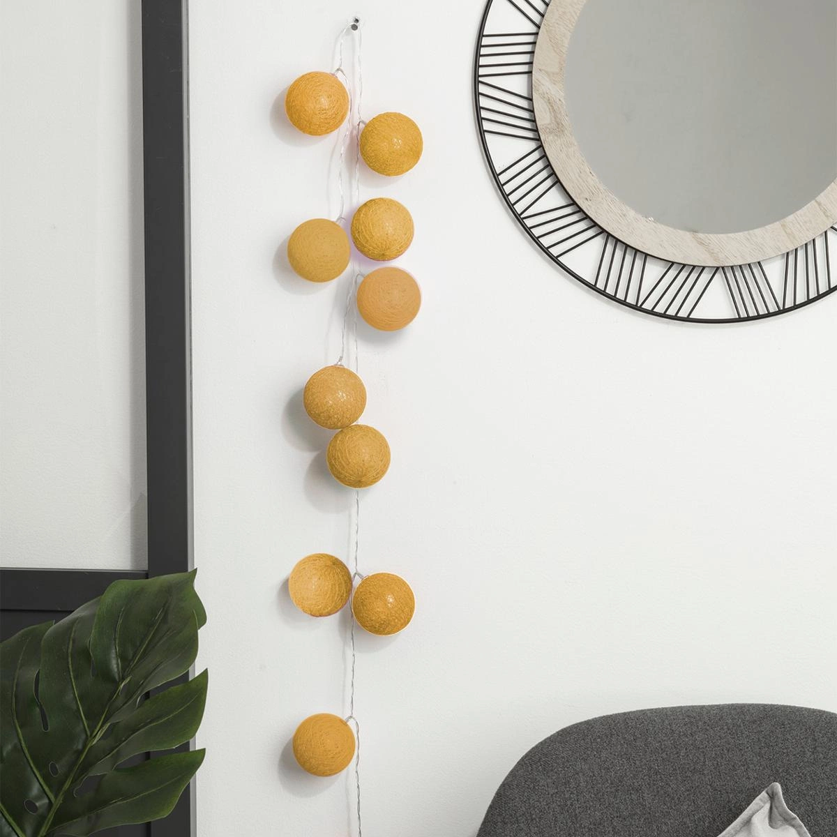 Żółta girlanda LED tworzy łagodne, ciepłe światło, które wprowadza do wnętrza nastrojową atmosferę. Sprawdzi się jako światełka cotton balls do pokoju dziecka, delikatnie rozpraszając mrok i ułatwiając zasypianie. Dzięki stylowym, ręcznie wykonanym kulom girlanda pięknie prezentuje się zawieszona nad łóżkiem, na ścianie, oknie lub półce, podkreślając indywidualny charakter aranżacji.