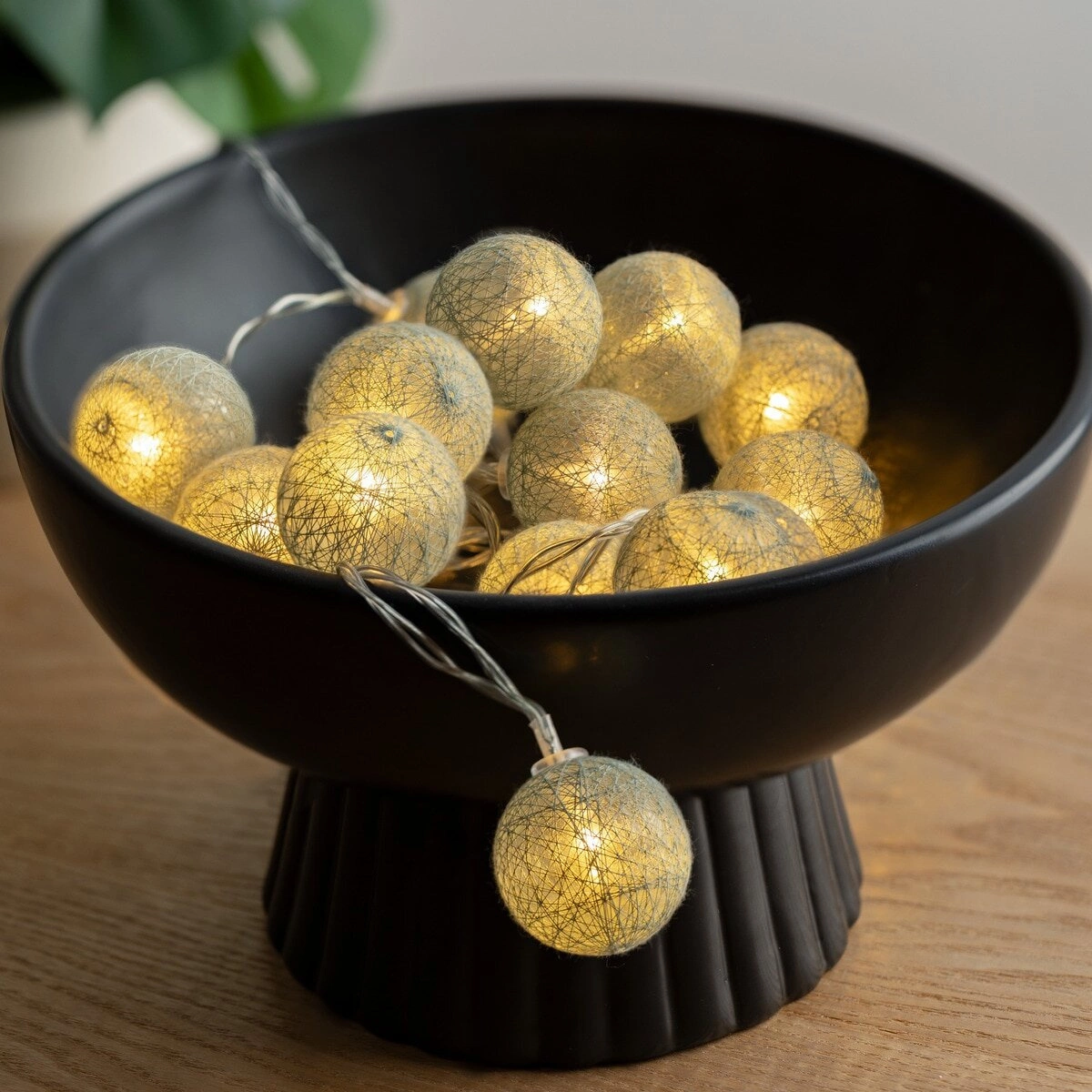 Girlanda świetlna LED Cotton Balls seledynowa marki Atmosphera to stylowy i nastrojowy dodatek, który odmieni każde wnętrze. Składa się z 16 okrągłych kul wykonanych z bawełny w świeżym, seledynowym odcieniu, rozmieszczonych na przewodzie o długości 255 cm. Dzięki zasilaniu na baterie (3xAA), girlanda jest niezwykle uniwersalna i nie wymaga podłączenia do prądu – możesz ją swobodnie zawiesić tam, gdzie chcesz, bez ograniczeń wynikających z dostępu do gniazdka.