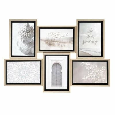 Zastosowanie trzech pionowych i trzech poziomych miejsc na zdjęcia dodaje kreatywności i różnorodności aranżacji. Ramka wykonana została z trwałej płyty MDF oraz szkła, co gwarantuje nie tylko estetyczny wygląd, ale także ochronę zdjęć przed zniszczeniem. Jej naturalny kolor w połączeniu z czarnymi krawędziami nadaje jej minimalistyczny, a zarazem elegancki charakter.