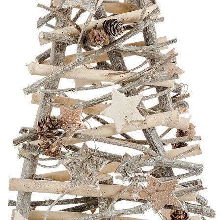 Naturalny kolor drewna, z którego wykonana jest choinka, wprowadzi do Twojego wnętrza ciepło i przytulność. Białe gwiazdki i brązowe szyszki na gałązkach dodadzą świątecznego klimatu i uczynią tę choinkę pięknym elementem dekoracyjnym. Niezależnie od stylu Twojego wnętrza, ta choinka z pewnością do niego pasuje i doda mu uroku.
