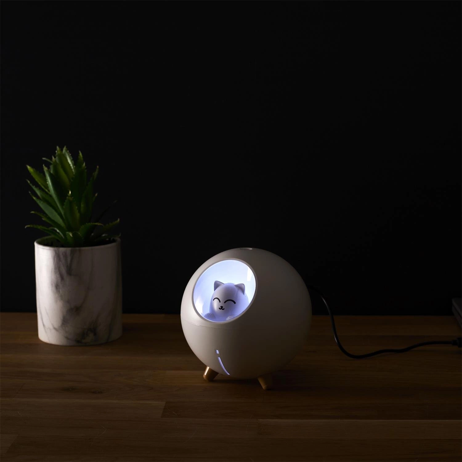 Motyw kota w białej, minimalistycznej formie doskonale wpisuje się w trendy nowoczesnych wnętrz. Ten dyfuzor zapachowy jest nie tylko praktycznym dodatkiem, który pozwala rozprzestrzenić ulubiony olejek zapachowy w całym pomieszczeniu, ale również stylową dekoracją – świetnie prezentuje się zarówno w salonie, jak i sypialni czy pokoju dziecięcym. Zastosowanie oświetlenia LED buduje nastrojową atmosferę, podkreślając wybrany charakter wnętrza.