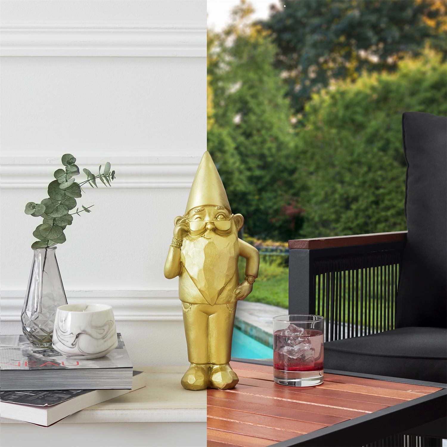 Figurka dekoracyjna Gnom Star marki Intesi to wyjątkowy akcent, który wnosi nowoczesny styl i odrobinę humoru do każdego wnętrza oraz ogrodu. Wysokość 33 cm i połyskujące, złote wykończenie sprawiają, że ten gnom przyciąga wzrok zarówno na komodzie w salonie, jak i wśród roślin na tarasie czy balkonie. Wykonany z odpornego na warunki zewnętrzne tworzywa, jest idealną ozdobą nie tylko do domu, ale również do przestrzeni na świeżym powietrzu.