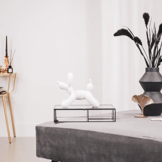 Balonowy pies w wersji dekoracyjnej to niebanalny pomysł na podkreślenie charakteru każdego nowoczesnego wnętrza. Figurka dekoracyjna w białym kolorze świetnie prezentuje się zarówno na komodzie, półce, jak i biurku czy konsoli w przedpokoju. Zabawna, ale jednocześnie stylowa forma sprawia, że pasuje do przestrzeni urządzonych w duchu modern czy glamour, wprowadzając do nich odrobinę lekkości i kreatywności.