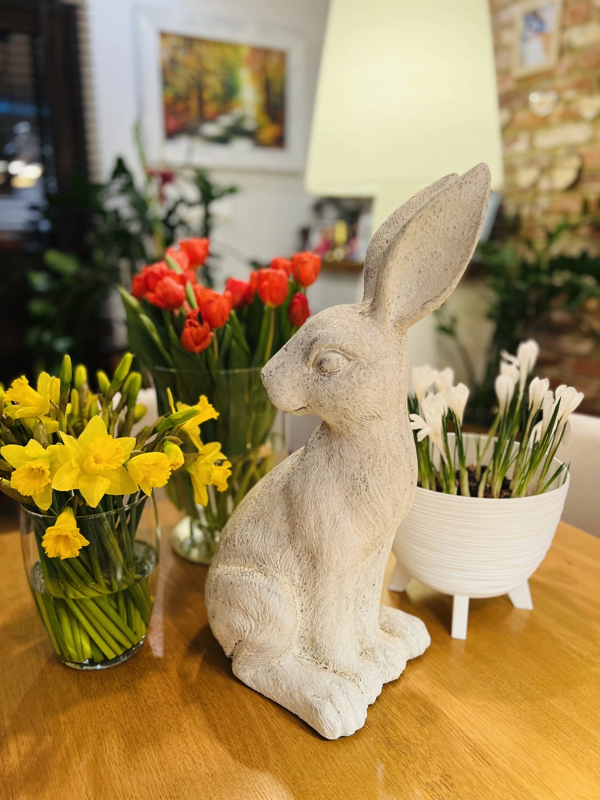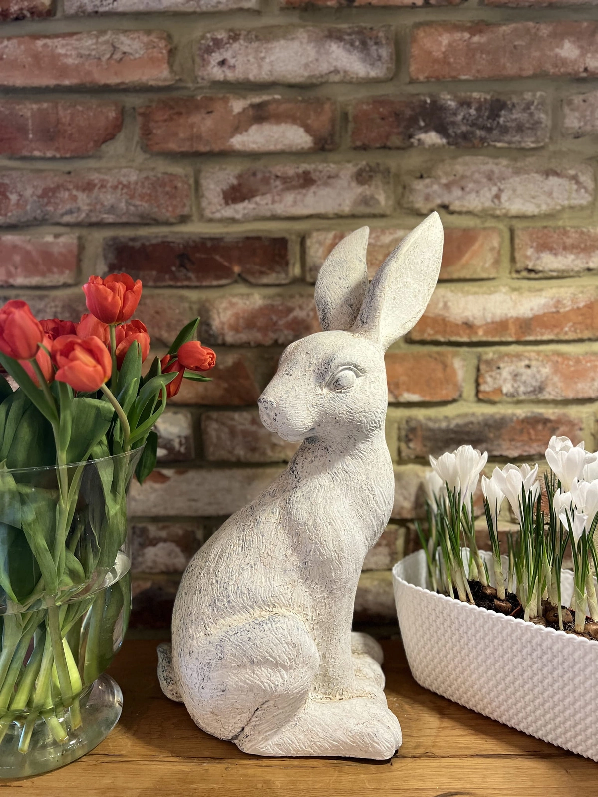 Duża figurka zająca doskonale nadaje się do aranżacji zarówno podczas świątecznego śniadania, jak i na co dzień. Jej beżowa kolorystyka pięknie komponuje się z nowoczesnymi i minimalistycznymi wnętrzami, a przemyślany design pozwala wykorzystać ją jako centralną ozdobę stołu, komody lub parapetu. Dzięki wysokości 52 cm i szerokości 31 cm figurka staje się wyraźnym elementem dekoracyjnym, który nie dominuje, lecz podkreśla charakter pomieszczenia.