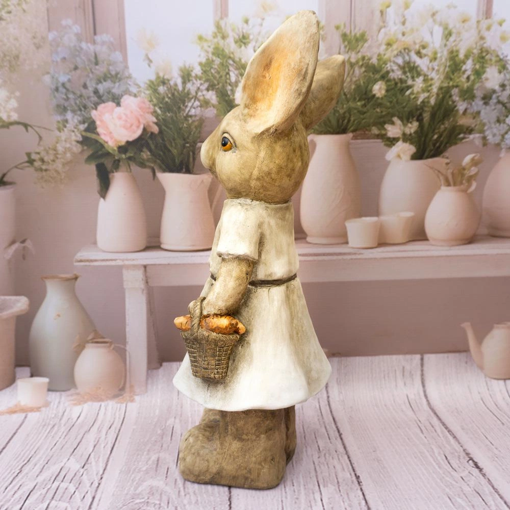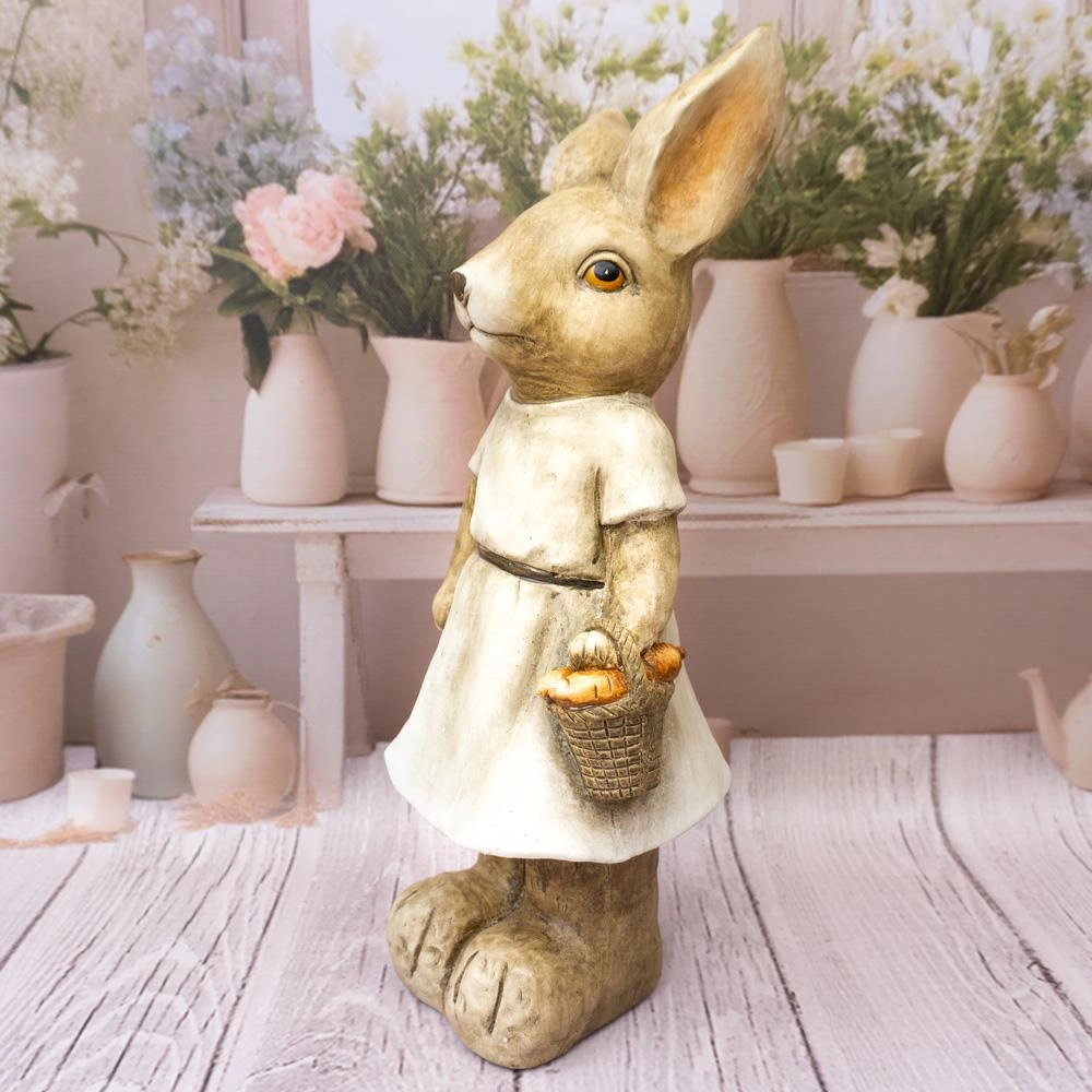 Figurka zając w sukience marki Intesi prezentuje się doskonale zarówno na stole w jadalni, jak i na komodzie w salonie czy w przedpokoju. Ozdoba świetnie wpisuje się w aranżacje w stylu klasycznym oraz nowoczesnym, subtelnie podkreślając wiosenny i świąteczny klimat. Dzięki neutralnym barwom komponuje się z różnorodnymi dekoracjami oraz naturalnymi akcentami, takimi jak świeże kwiaty czy gałązki bukszpanu.