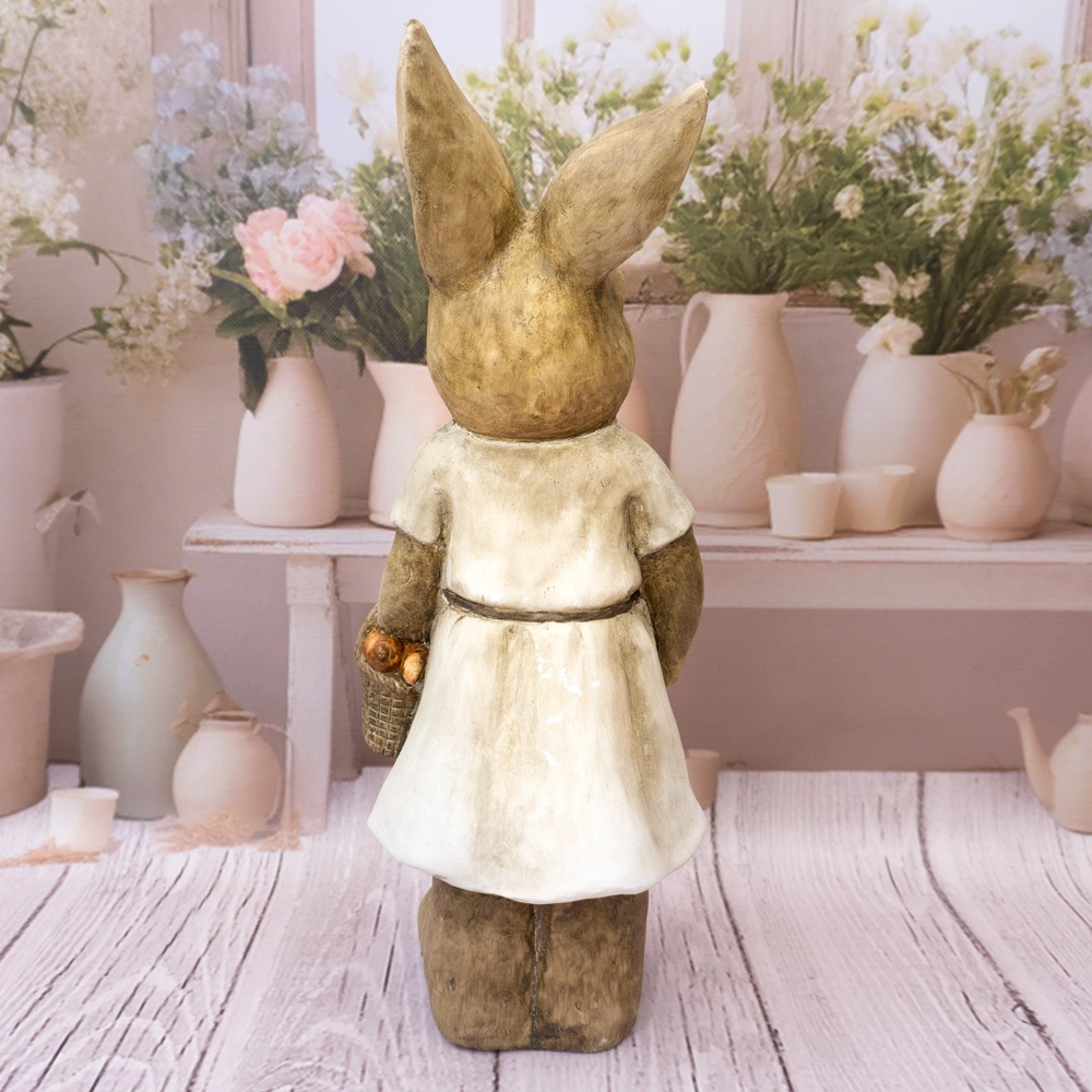 Figurka wielkanocna zając w sukience marki Intesi to wyjątkowa ozdoba o wysokości 55 cm, która zachwyca starannym wykonaniem i subtelną kolorystyką w odcieniach beżu oraz bieli. Stworzona z trwałej żywicy poliestrowej, doskonale sprawdzi się jako dekoracja stojąca na stole, komodzie lub parapecie w salonie, jadalni czy sypialni. Jej urokliwy, świąteczny charakter sprawia, że to figurka wielkanocna, która wprowadza do wnętrza radosną atmosferę i elegancję.