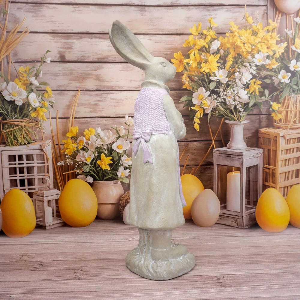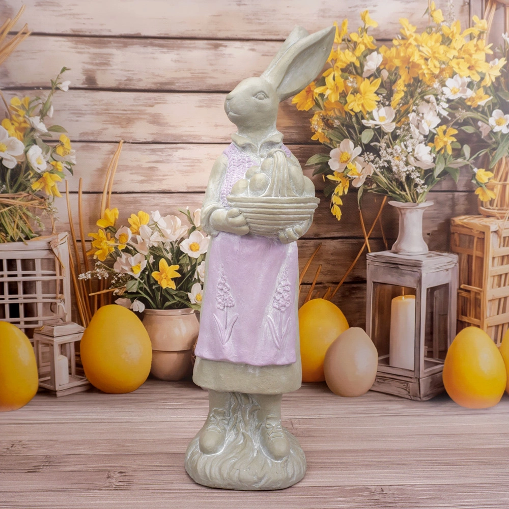 Figurka Pani Zając marki Intesi to wyjątkowa, duża dekoracja wielkanocna o wysokości 80 cm, wykonana z trwałej żywicy w odcieniach różu i szarości. Dzięki efektownemu koszowi i starannie dopracowanym detalom, ta figurka zająca staje się niepowtarzalnym akcentem na stół, komodę lub do postawienia w salonie. Jej imponujący rozmiar sprawia, że natychmiast przyciąga uwagę, wprowadzając do wnętrza nie tylko wiosenną atmosferę, ale także nutę elegancji i radości świąt.