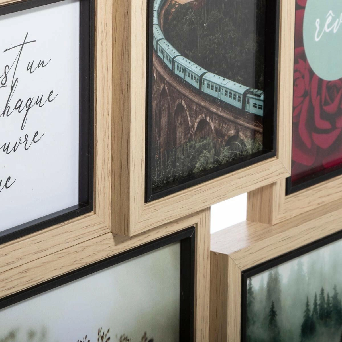 Ramka na zdjęcia Kyle od Atmosphera to idealny sposób na wyeksponowanie Twoich ulubionych fotografii w elegancki i stylowy sposób. Wykonana z płyty pilśniowej, papieru i szkła, ramka ma wymiary 58,5 cm szerokości, 2,8 cm głębokości i 49,2 cm wysokości. Pomieści dziesięć zdjęć o wymiarach 10 x 15 cm, co pozwala na stworzenie pięknej galerii wspomnień. Nieregularny układ ramek dodaje całości dynamiki i oryginalności, a naturalny kolor ramy idealnie wpasuje się zarówno w nowoczesne, jak i vintage wnętrza.