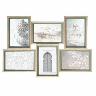 Zastosowanie trzech pionowych i trzech poziomych miejsc na zdjęcia dodaje kreatywności i różnorodności aranżacji. Ramka wykonana została z trwałej płyty MDF oraz szkła, co gwarantuje nie tylko estetyczny wygląd, ale także ochronę zdjęć przed zniszczeniem. Jej naturalny kolor w połączeniu z ciemnozielonymi krawędziami nadaje jej minimalistyczny, a zarazem elegancki charakter.