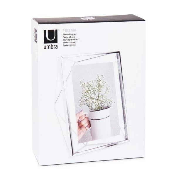 Ramka na zdjęcia 13x18 Prisma Umbra to nowoczesny akcent dekoracyjny wykonany z chromowanego metalu i szkła, który efektownie podkreśli Twoje ulubione fotografie. Uniwersalny srebrny kolor oraz geometryczna forma sprawiają, że ramka doskonale wpisuje się w eleganckie, minimalistyczne i designerskie wnętrza. Model Prisma Umbra oferuje zarówno opcję stojącą, jak i wiszącą, dzięki czemu możesz wyeksponować zdjęcie 13x18 cm na ścianie lub postawić je na komodzie, biurku czy półce.