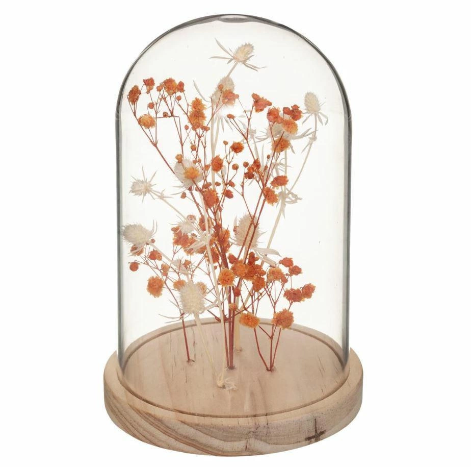 Kompozycja z suszonych kwiatów pod szklanym kloszem stanowi piękną i ciekawą dekorację każdego naturalnego wnętrza. Dekoracja umieszczona na drewnianej podstawie jest wykonana z suszonych roślin i szkła, a jego waga wynosi 0,307 kg.