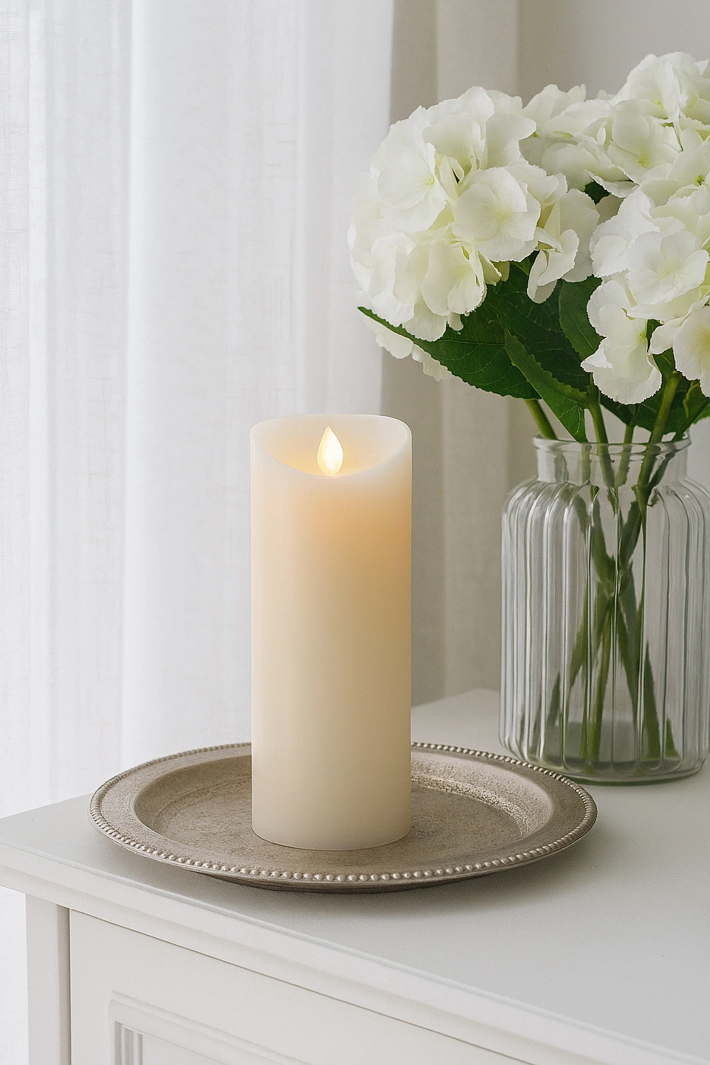 Model o wysokości 20 cm i szerokości 10 cm świetnie prezentuje się zarówno pojedynczo, jak i w zestawieniu z innymi świecami – na komodzie, stole, półce czy parapecie. Kremowa barwa doskonale komponuje się z naturalnymi dodatkami, drewnem czy tekstyliami, wprowadzając harmonię i spokój do każdego wnętrza. Świeca LED nie nagrzewa się, więc możesz swobodnie ustawić ją w sypialni, łazience czy przedpokoju, nie martwiąc się o bezpieczeństwo i zabrudzenia woskiem.