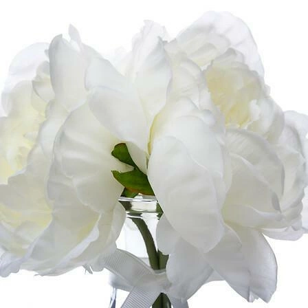 - Kompozycja składa się z trzech sztucznych piwonii umieszczonych w szklanym wazonie