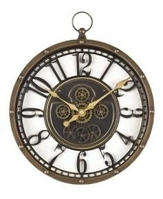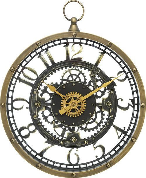 Zegar Meca w stylu industrialnym w kolorze postarzanego złota z ażurową tarczą przypominającą pracujące tryby to świetny dodatek do każdego pomieszczenia.