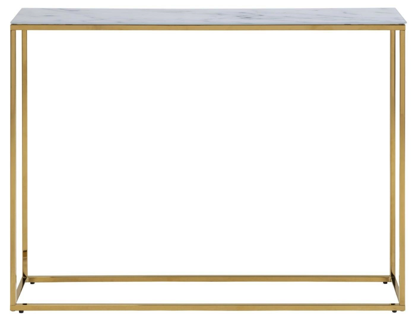 KONSOLA ALISMA to część większej kolekcji. Jest to stolik konsolowy w stylu glamour do przedpokoju i nie tylko. Prostokątny blat z mlecznego szkła o grubości 6 mm posiada wzór imitujący biały marmur i świetnie współgra z chromowaną metalową podstawą w kolorze złota. Ergonomiczna wielkość pozwala optymalnie wykorzystać wielkość blatu, który sprawdzi się nie tylko w przedpokoju pod lustrem, ale i w sypialni lub salonie. Jest to niezwykle elegancki mebel, który już na pierwszy rzut oka urzeka wyrafinowaną, choć równocześnie pozbawioną nadmiernej ekstrawagancji estetyką.
