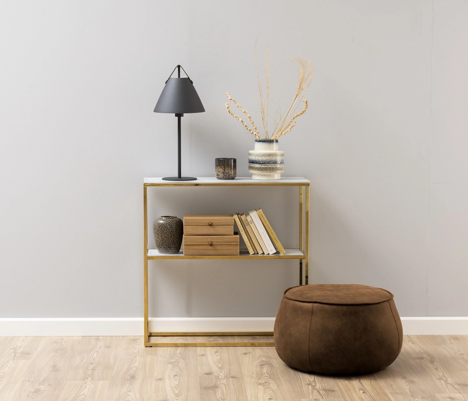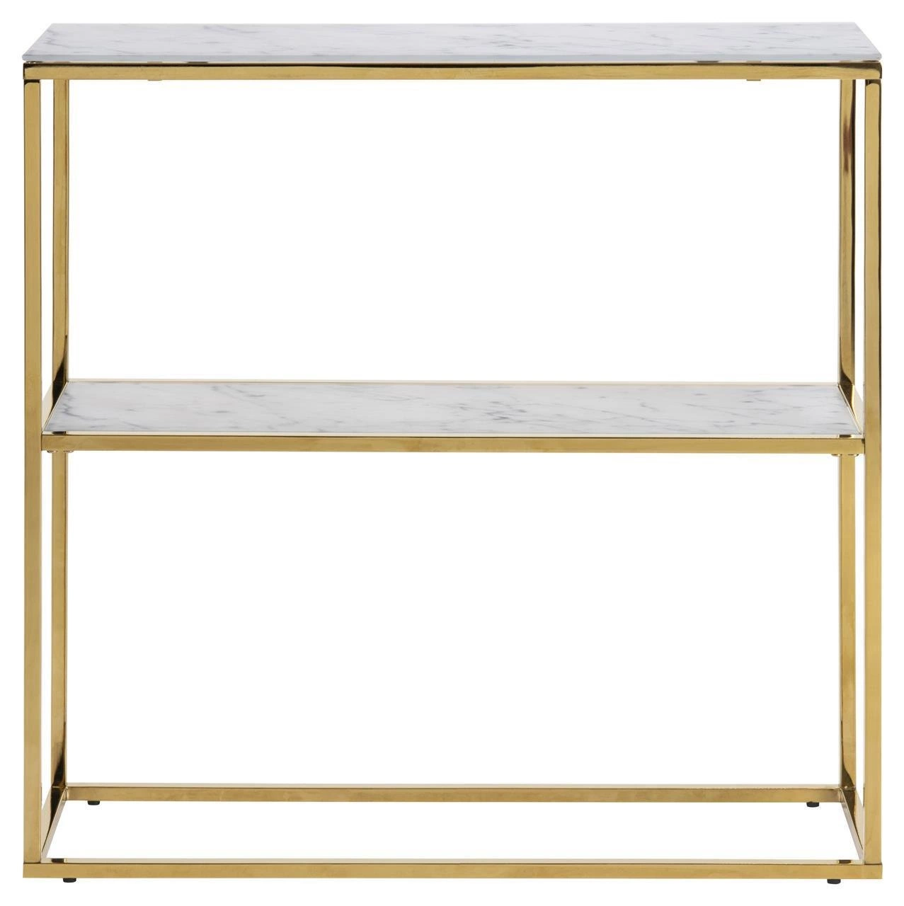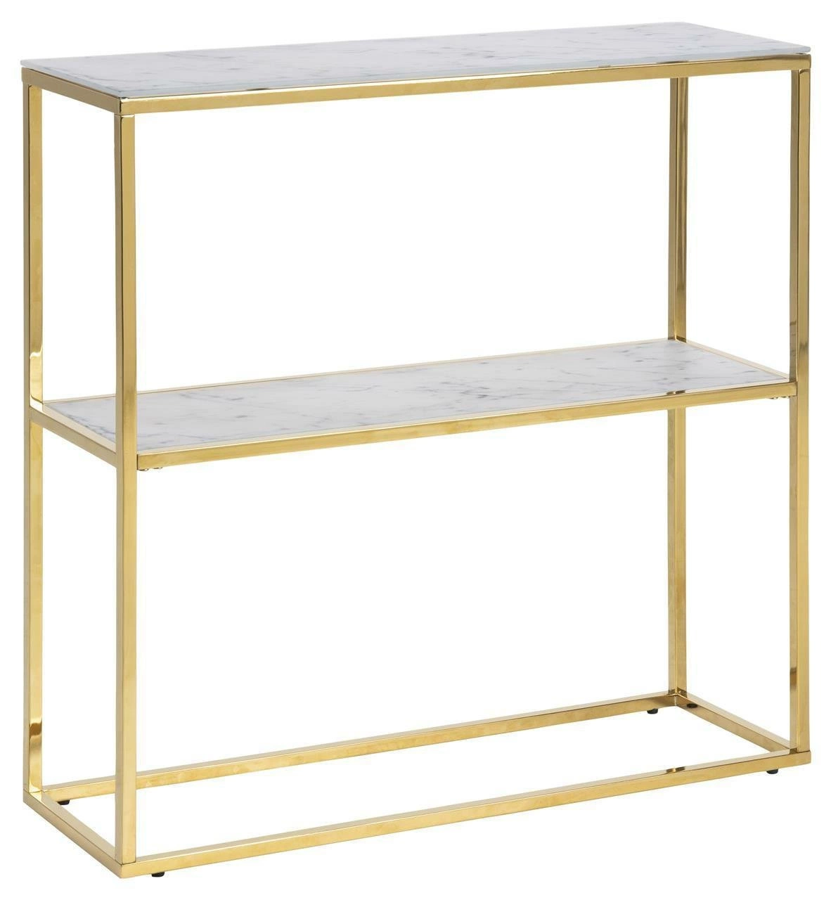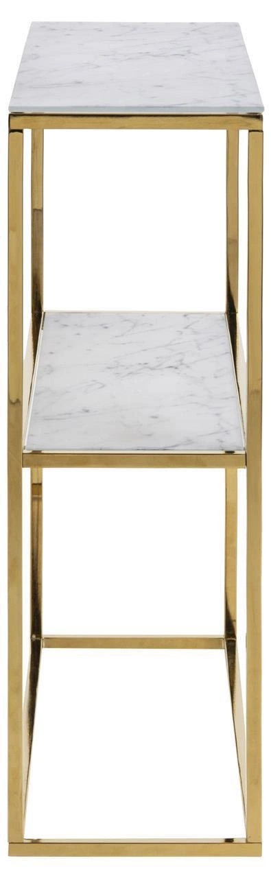 Alisma- nowoczesna konsola z półką w stylu glamour to propozycja dedykowana fanom wysmakowanego wzornictwa. Prostokątnym blatom wykonanym z mlecznego szkła o grubości 6 mm i pomalowanym od spodu we wzór imitujący marmur towarzyszy chromowana metalowa podstawa w kolorze złotym. Dzięki przemyślanemu rozmieszczeniu blatów konsoli możemy wykorzystać przestrzeń w optymalny sposób. Podstawa komody została zrobiona z 4 nóg, które dodatkowo zabezpieczone są wspornikami, które odpowiedzialne są za stabilność konsoli. To niezwykle elegancki mebel, który już na pierwszy rzut oka urzeka wyrafinowaną, choć równocześnie pozbawioną nadmiernej ekstrawagancji estetyką. Konsola została wyposażona w cztery stopki z tworzywa, które chronią podłogę i poziomują konsolę.