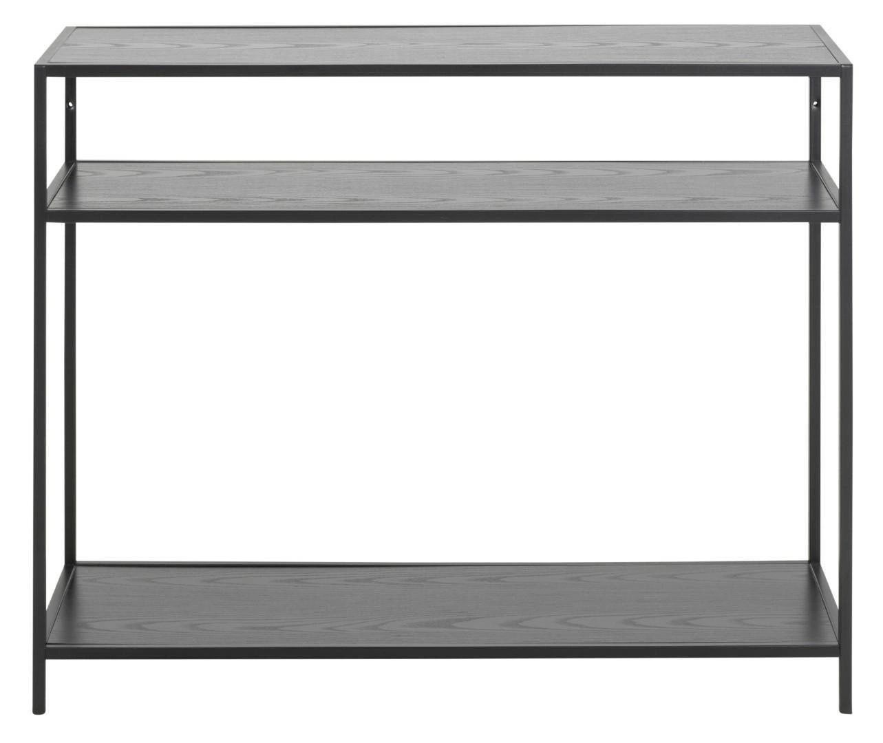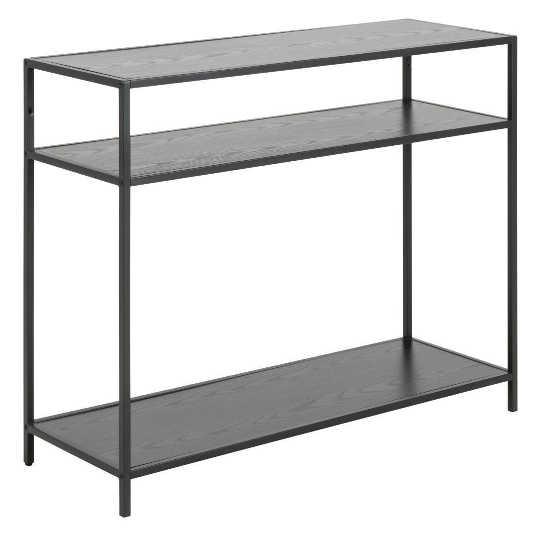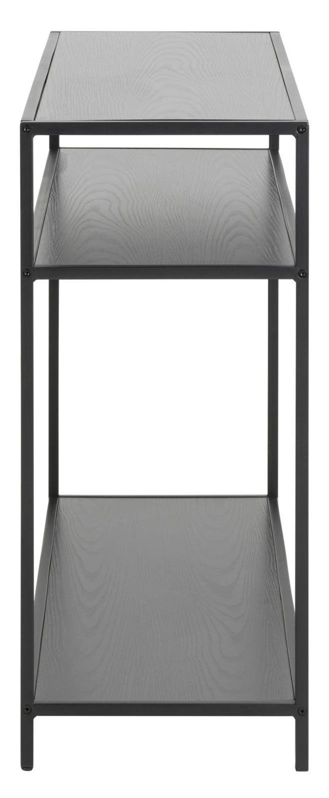 Konsola Seaford to industrialny mebel o prostej i eleganckiej formie. Metalowa konstrukcja została pomalowana proszkowo na czarno. Czarne półki z MDF zostały pokryte czarną okleiną o strukturze drewna dębu. Konsola składa się z trzech półek. Waga: 12 kg.
