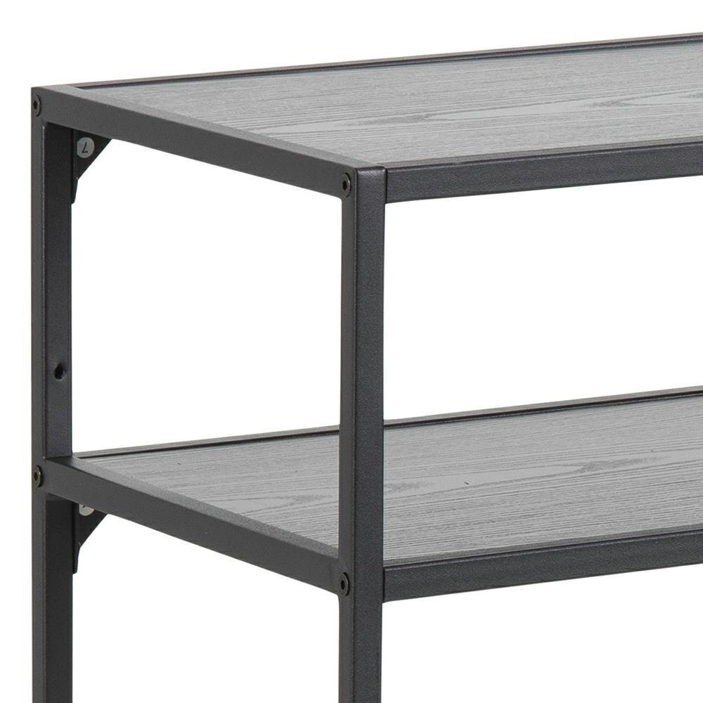 Konsola Seaford świetnie wkomponuje się zarówno w pomieszczenia urządzone w stylu industrialnym, jak i te w klasycznej odsłonie. Podstawa konsoli wykonana została z metalu malowanego proszkowo w wykończeniu matowym. Mebel bez problemu posłuży nam przez długi czas. Blat, usytuowany na podstawie został wykonany z płyty MDF laminowanej czarną okleiną imitującą słoje drewna, co w połączeniu z czarnym stelażem tworzy elegancką, spójną całość. Konsola posiada dodatkową półkę również z MDF, na której możemy postawić swoje ulubione książki, czasopisma lub kosze z drobiazgami.