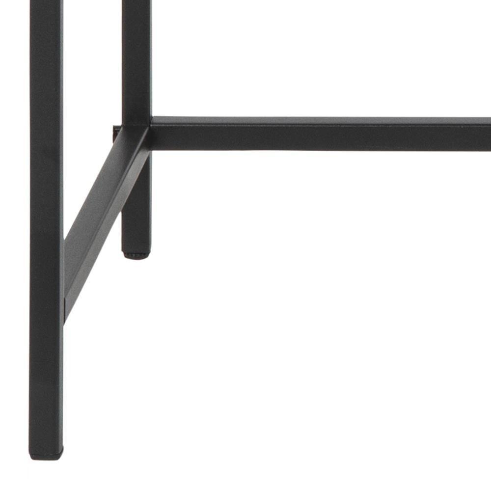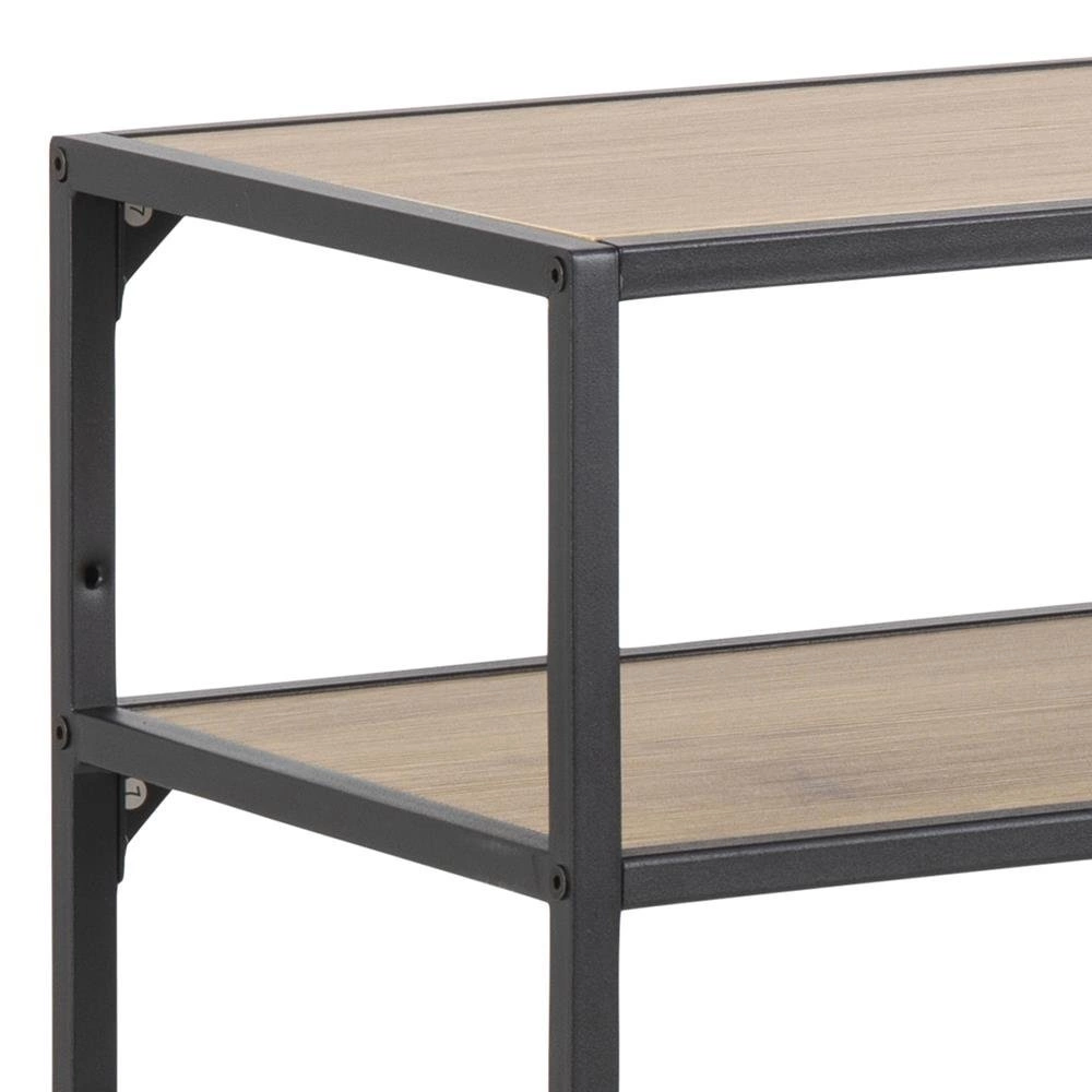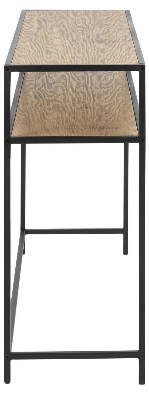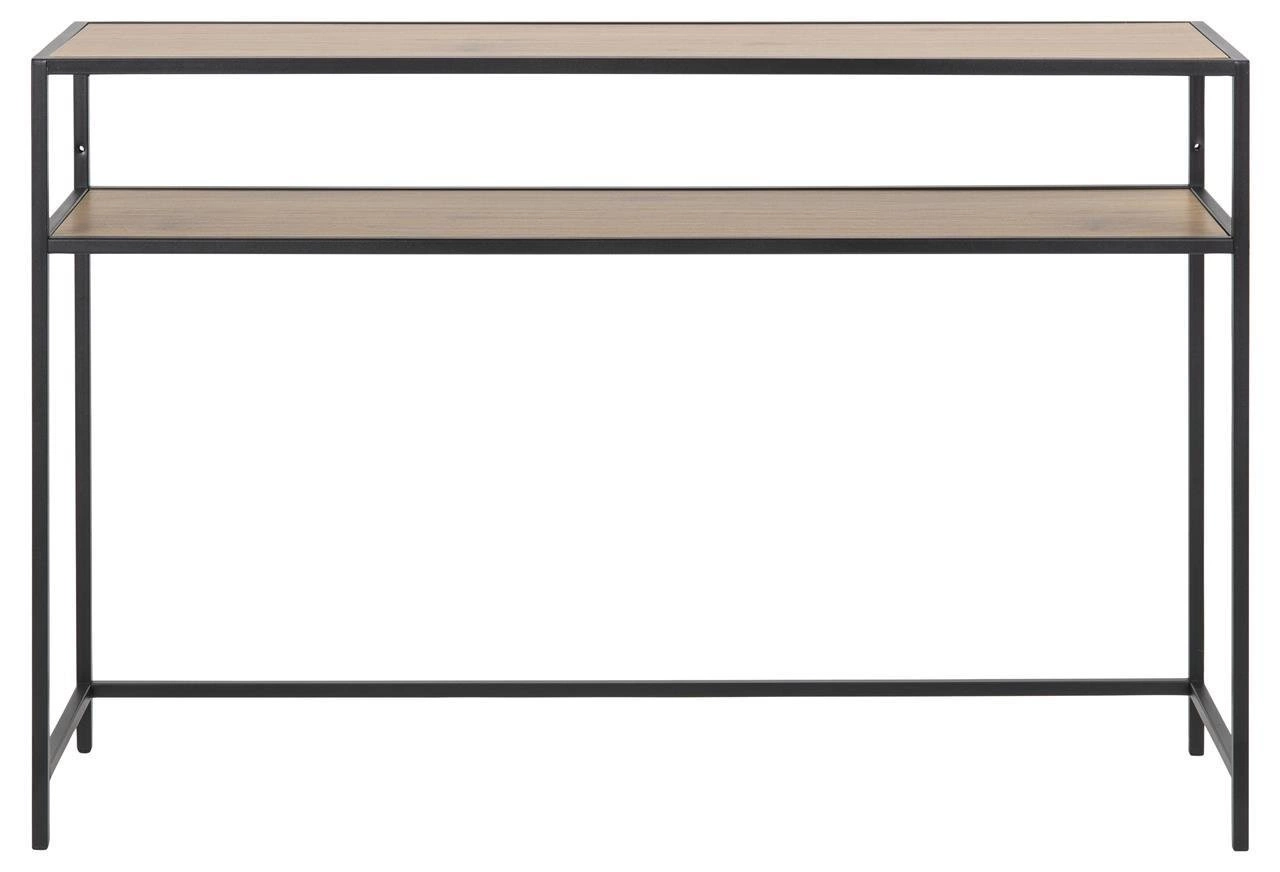 Konsola Seaford świetnie wkomponuje się zarówno w pomieszczenia urządzone w stylu industrialnym, jak i te w klasycznej odsłonie. Podstawa konsoli wykonana została z metalu malowanego proszkowo w wykończeniu matowym. Mebel bez problemu posłuży nam przez długi czas. Blat, usytuowany na podstawie został wykonany z płyty MDF laminowanej okleiną imitującą drewno dębu, co w połączeniu z czarnym stelażem tworzy elegancką, spójną całość. Konsola posiada dodatkową półkę również z MDF, na której możemy postawić swoje ulubione książki, czasopisma lub kosze z drobiazgami.