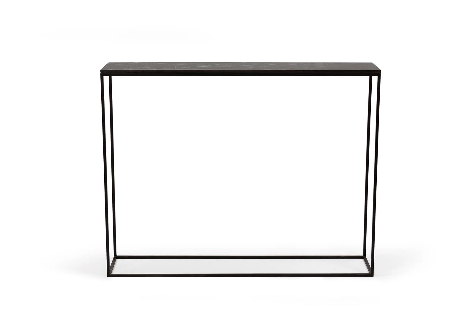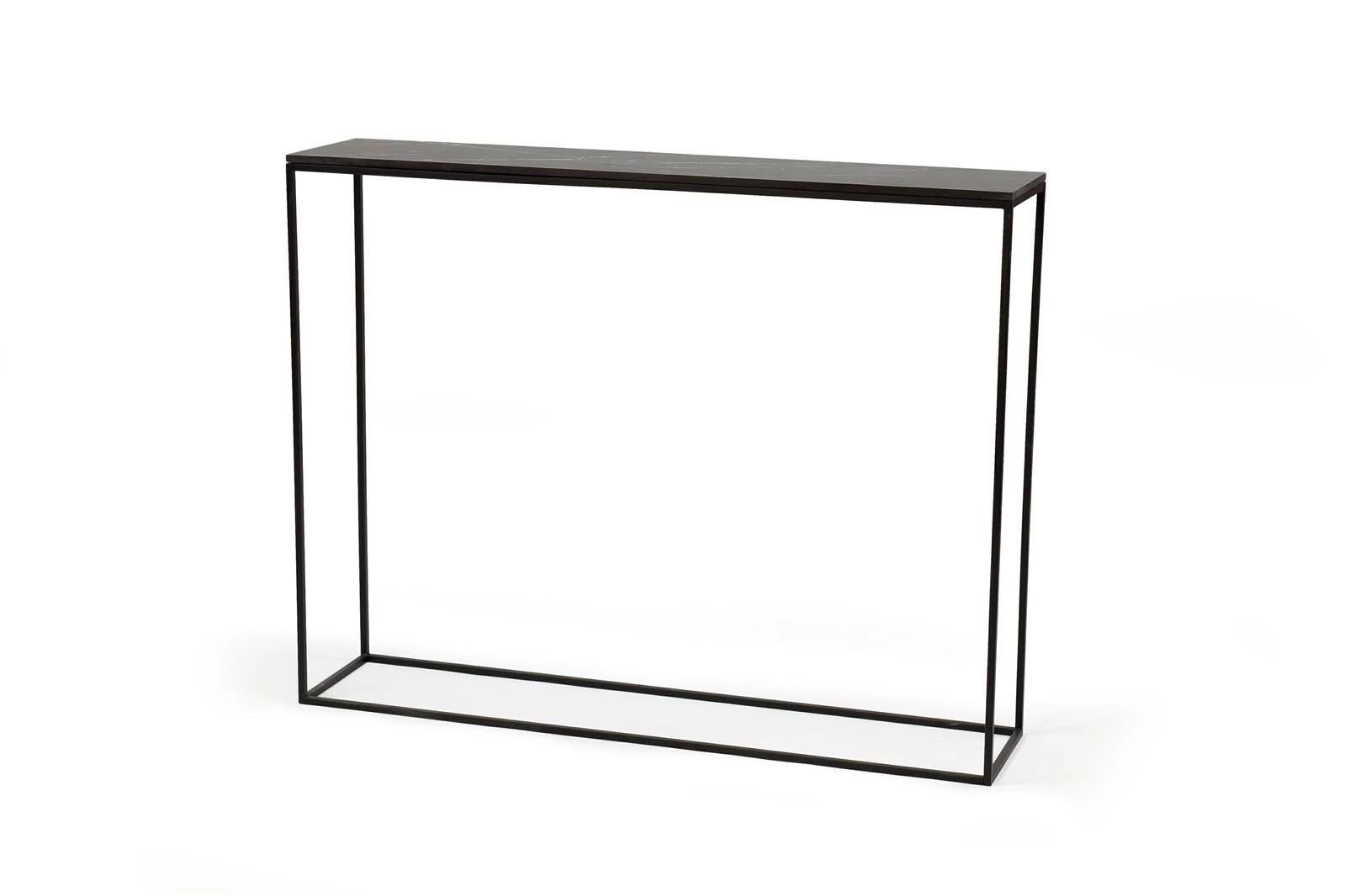 Delikatna forma konsoli STAM 200 to przede wszystkim minimalizm, funkcjonalność i prostota. Dzięki czemu konsola STAM jest uniwersalna i ponadczasowa. Ciemny marmurowy blat i czarny metalowy stelaż dobrze łączy się z innymi stylami i jest zawsze na miejscu. WYMIARY: Wysokość: 78 cm Głębokość: 22 cm Szerokość: 100cm MATERIAŁ: Metal, malowany proszkowo. Waga: 9,5