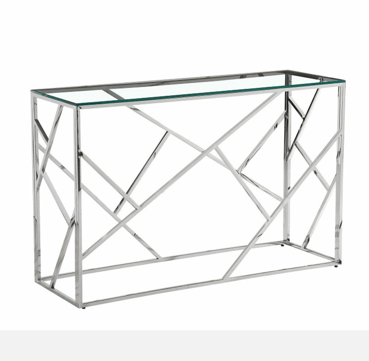 Konsola szklana Zyra marki Intesi to nowoczesny stolik przyścienny o długości 120 cm, który zachwyca połączeniem transparentnego blatu ze srebrną, połyskującą podstawą. Wykonana ze szkła i metalu, prezentuje się wyjątkowo lekko i elegancko, jednocześnie gwarantując praktyczną powierzchnię użytkową. Jej minimalistyczna forma sprawdzi się doskonale jako konsola do przedpokoju, stolik konsolowy do salonu lub stylowy akcent w sypialni.