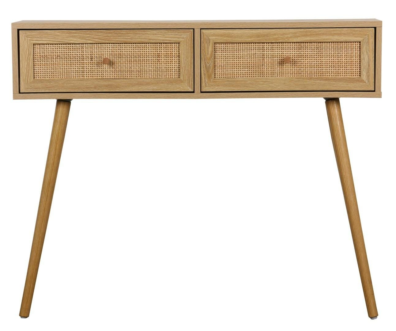 Konsola z szufladami Ballo marki Intesi to połączenie naturalnego rattanu i drewna sosnowego, zamknięte w lekkiej, boho formie. Wąski stolik przyścienny o szerokości 100 cm i głębokości 29 cm zapewnia funkcjonalność nawet w niewielkich przestrzeniach, a dwie praktyczne szuflady z plecionym frontem pozwalają na wygodne przechowywanie drobiazgów. To propozycja, która idealnie sprawdzi się jako konsola do przedpokoju, stolik do salonu lub nowoczesna toaletka do sypialni.