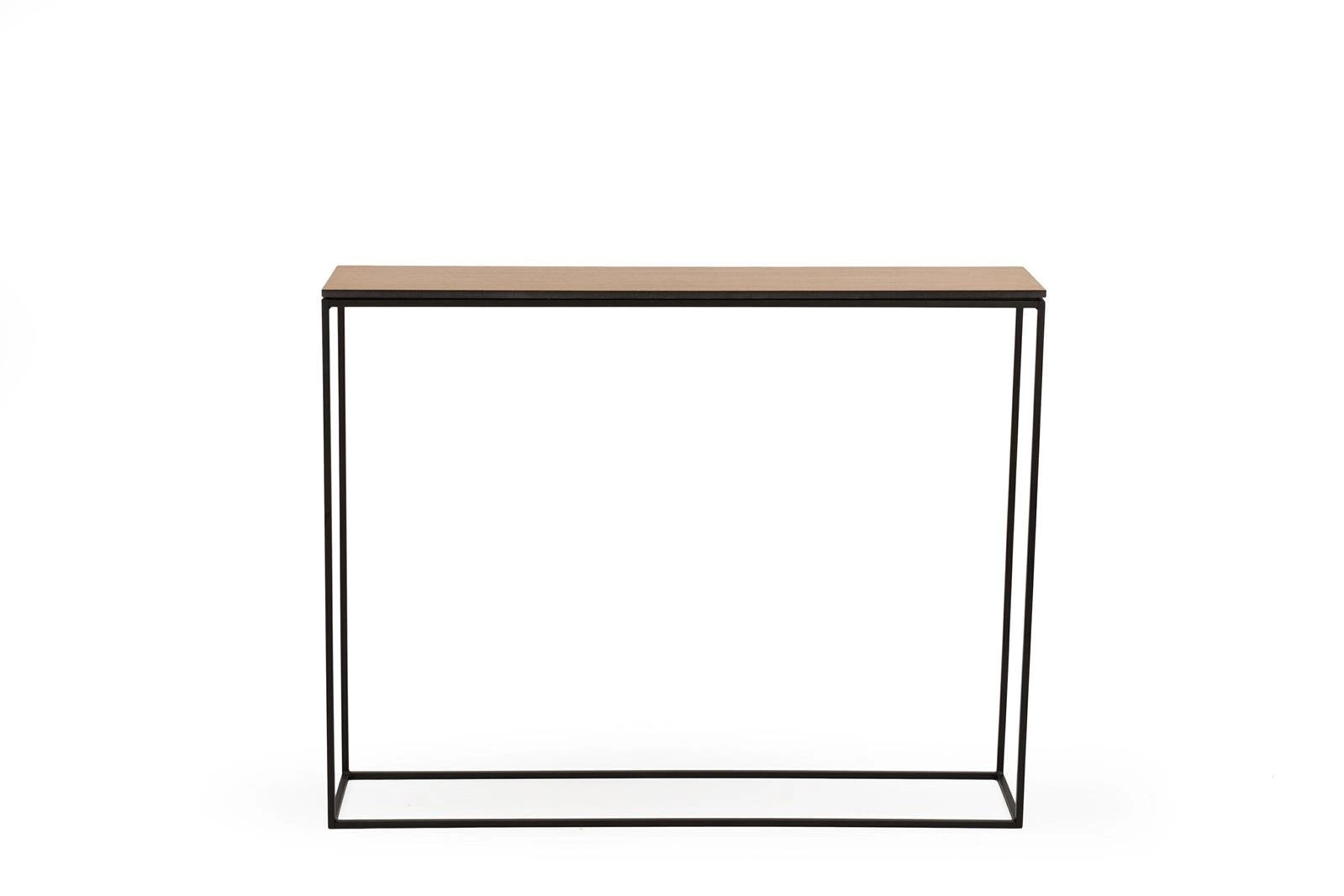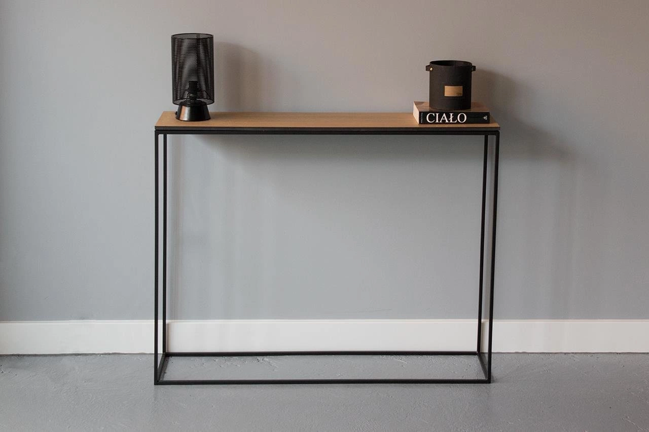 Jedną z najważniejszych cech stylu skandynawskiego je zachowanie równowagi. Kolejną jest połączenie z naturą widoczne w materiałach wykorzystywanych do produkcji mebli. Naturalny dębowy blat i stelaż w postaci ramy łączą te dwie cechy w genialny sposób. WYMIARY: Wysokość: 78 cm Głębokość: 22 cm Szerokość: 100cm MATERIAŁ: Metal, malowany proszkowo. Blat z naturalnym fornirem dębowym. Waga: 9,5,