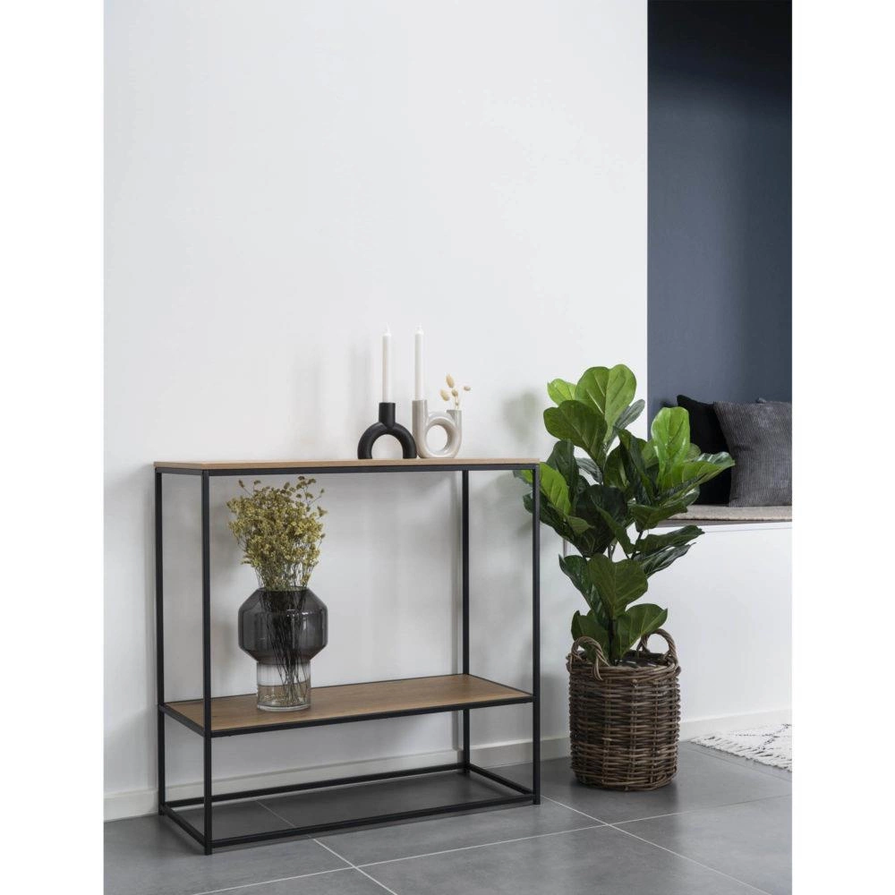 Loftowa konsola Vita z blatem oraz półką w okleinie koloru dębowego to niepowtarzalny mebel, który pełni kluczową rolę w każdym nowoczesnym przedpokoju lub salonie. Konsola to mebel, na którym możemy ustawić swój ulubiony wazon z suszonymi trawami pampasowymi, ale również może być ona miejscem na podręczne przedmioty jak klucze lub telefon. Połączenie konsoli z dużym lustrem doda wnętrzu nowoczesnego wyglądu.