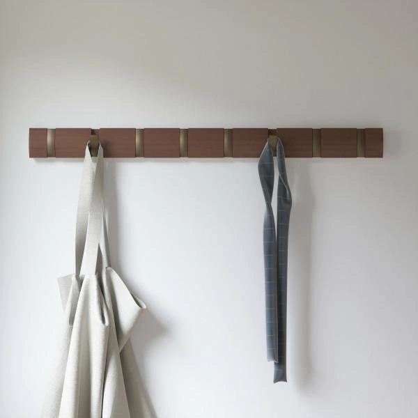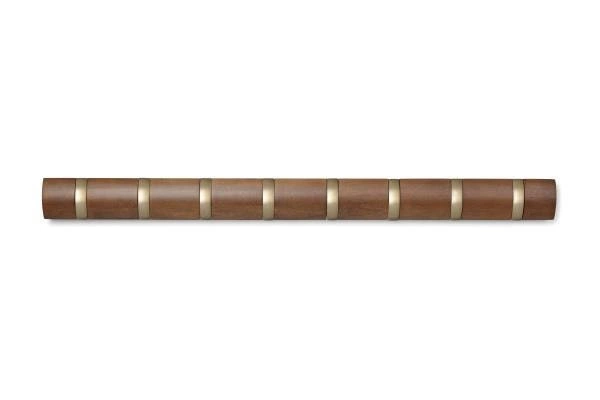 Wieszak na ubrania Umbra Flip orzechowy to masywna, solidnie wykonana listwa z ośmioma złotymi i wysuwanymi haczykami. Został on wykonany z tworzywa oraz drewna jesionu. Gdy haczyk nie jest potrzebny, złożysz go jednym ruchem ku górze. Ale nie daj się zwieść kompaktowemu wyglądowi, ponieważ Flip może pomieścić zaskakująco dużą liczbę przedmiotów, dzięki czemu jest idealnym miejscem do powieszenia płaszczy, szalików, torebek i innych rzeczy dla Ciebie, Twojej rodziny i gości. Dzięki eleganckiemu profilowi i ukrytemu elementowi montażowemu Flip montuje się bezproblemowo na praktycznie każdej ścianie i oferuje styl, który wygląda świetnie w każdym przedpokoju. Maksymalne obciążenie 2,3 kg na jeden haczyk.