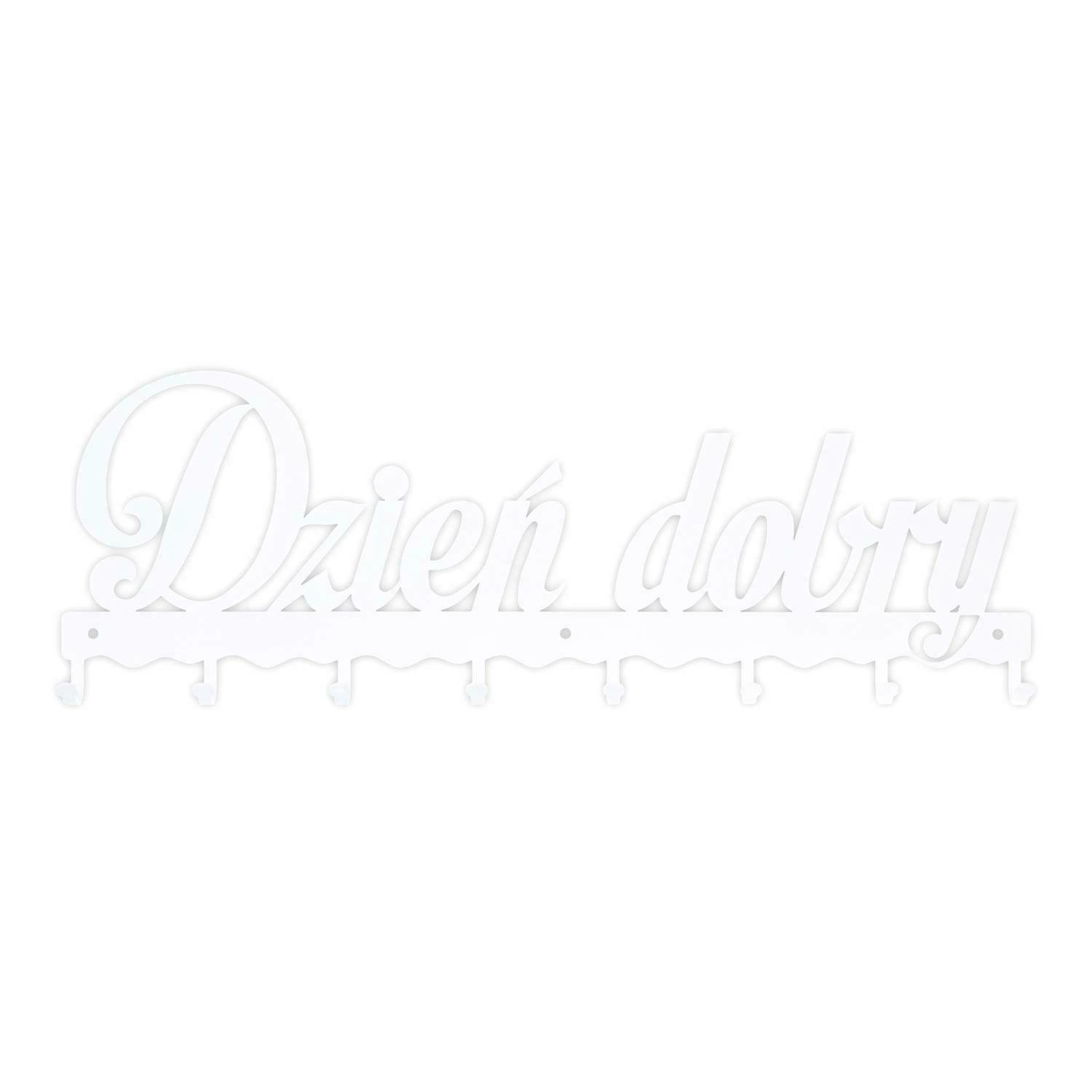 Wieszak ścienny do przedpokoju Dzień Dobry 01 biały metalowy marki Intesi to praktyczne i stylowe rozwiązanie, które pomoże Ci utrzymać porządek w każdym nowoczesnym wnętrzu. Wykonany z trwałego metalu, wieszak o szerokości 60 cm i wysokości 21 cm oferuje aż 8 uchwytów, na których wygodnie zawiesisz kurtki, płaszcze, torebki czy klucze. Uniwersalna biel i oryginalny napis „Dzień Dobry” wprowadzą pozytywną energię do Twojego przedpokoju, czyniąc go jeszcze bardziej gościnnym.