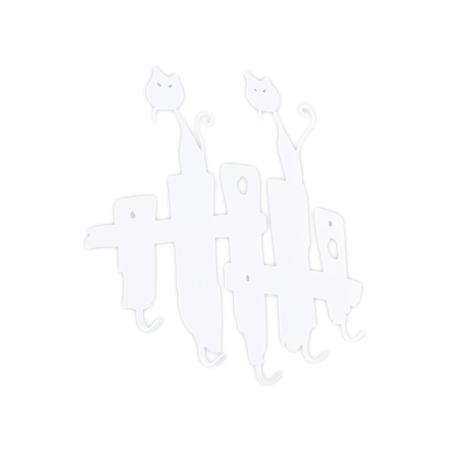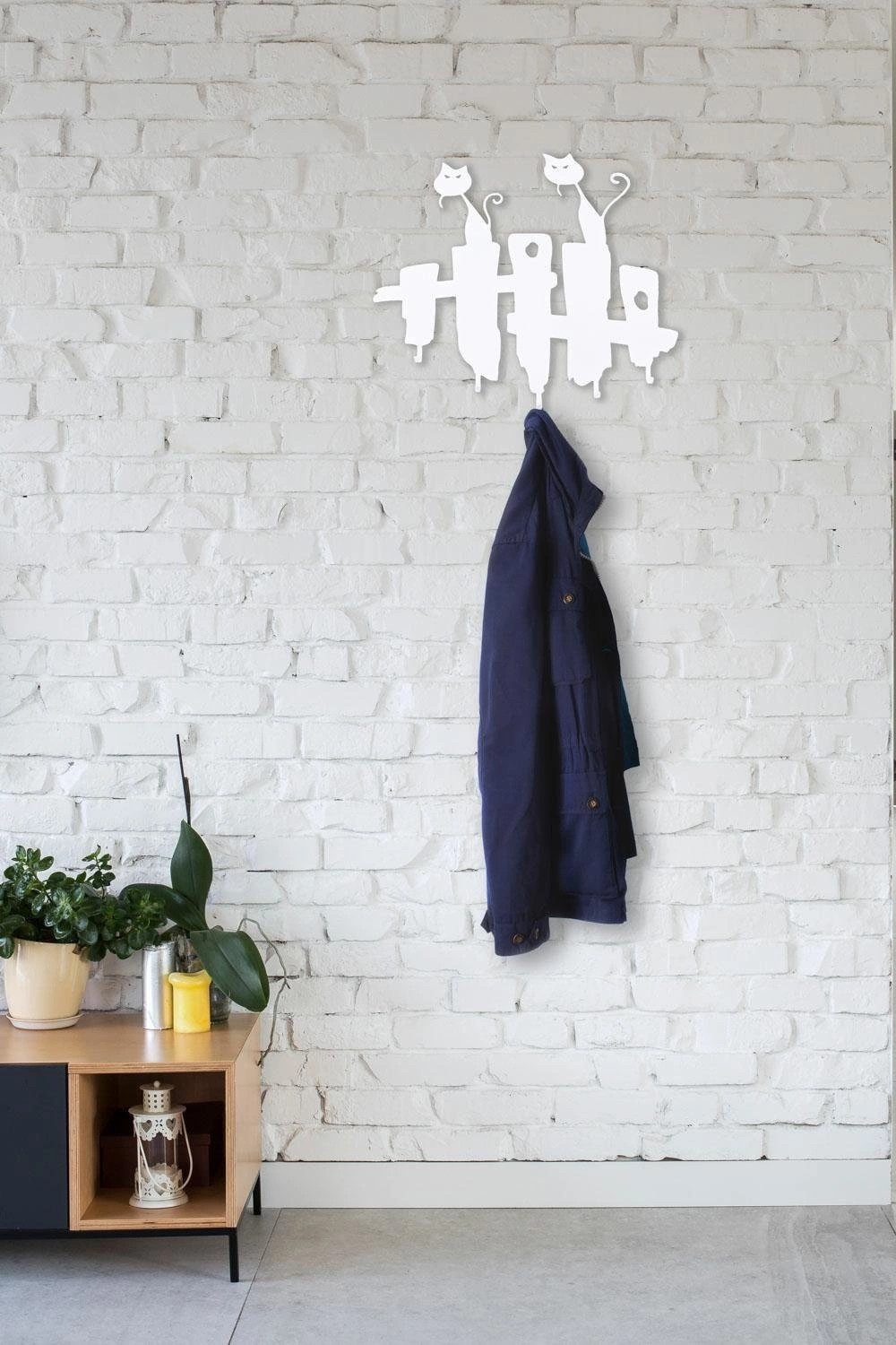 Wieszak ścienny Koty to stylowe rozwiązanie do przedpokoju, holu lub poczekalni. Wycięty laserowo wzór przedstawiający koty na płocie, nada uroku każdemu wnętrzu. Stalowy malowany proszkowo wieszak jest uniwersalny oraz odporny na uszkodzenia. Matowe wykończenie dodaje listwie stylu. Dzięki 5 haczykom o udźwigu do 3kg każdy, możemy powiesić na wieszaku klucze, kurtki lub nawet torby. Produkt dostępny jest w dwóch kolorach co zwiększa jego możliwości aranżacyjne. Maksymalne obciążenie to 15kg. Do wieszaka załączany jest zestaw montażowy, który składa się z kołków, zaślepek i śrubek.