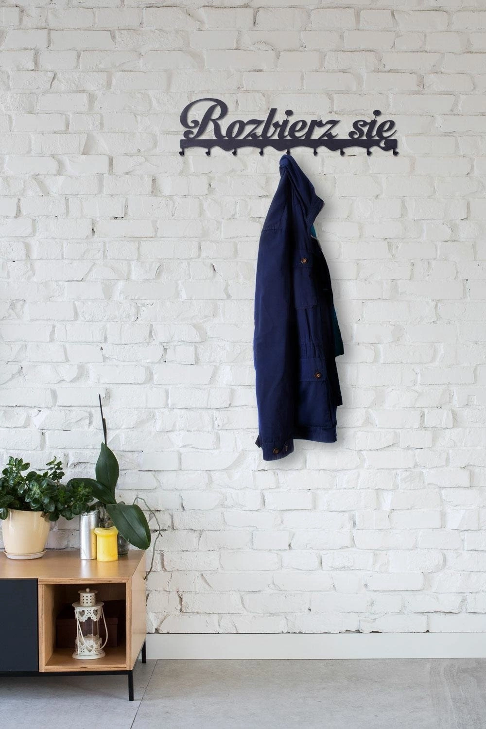 Wieszak ścienny Rozbierz się to stylowe rozwiązanie do przedpokoju, holu lub poczekalni. Jego precyzyjnie wycięty laserowo wzór, z frywolnym napisem, nada uroku każdemu wnętrzu. Stalowy malowany proszkowo wieszak jest uniwersalny oraz odporny na uszkodzenia. Matowe wykończenie dodaje listwie stylu. Dzięki aż 9 haczykom o udźwigu do 3kg każdy, możemy powiesić na wieszaku klucze, kurtki lub nawet torby. Produkt dostępny jest w dwóch kolorach co zwiększa jego możliwości aranżacyjne. Maksymalne obciążenie to 27kg. Do wieszaka załączany jest zestaw montażowy, który składa się z kołków, zaślepek i śrubek.