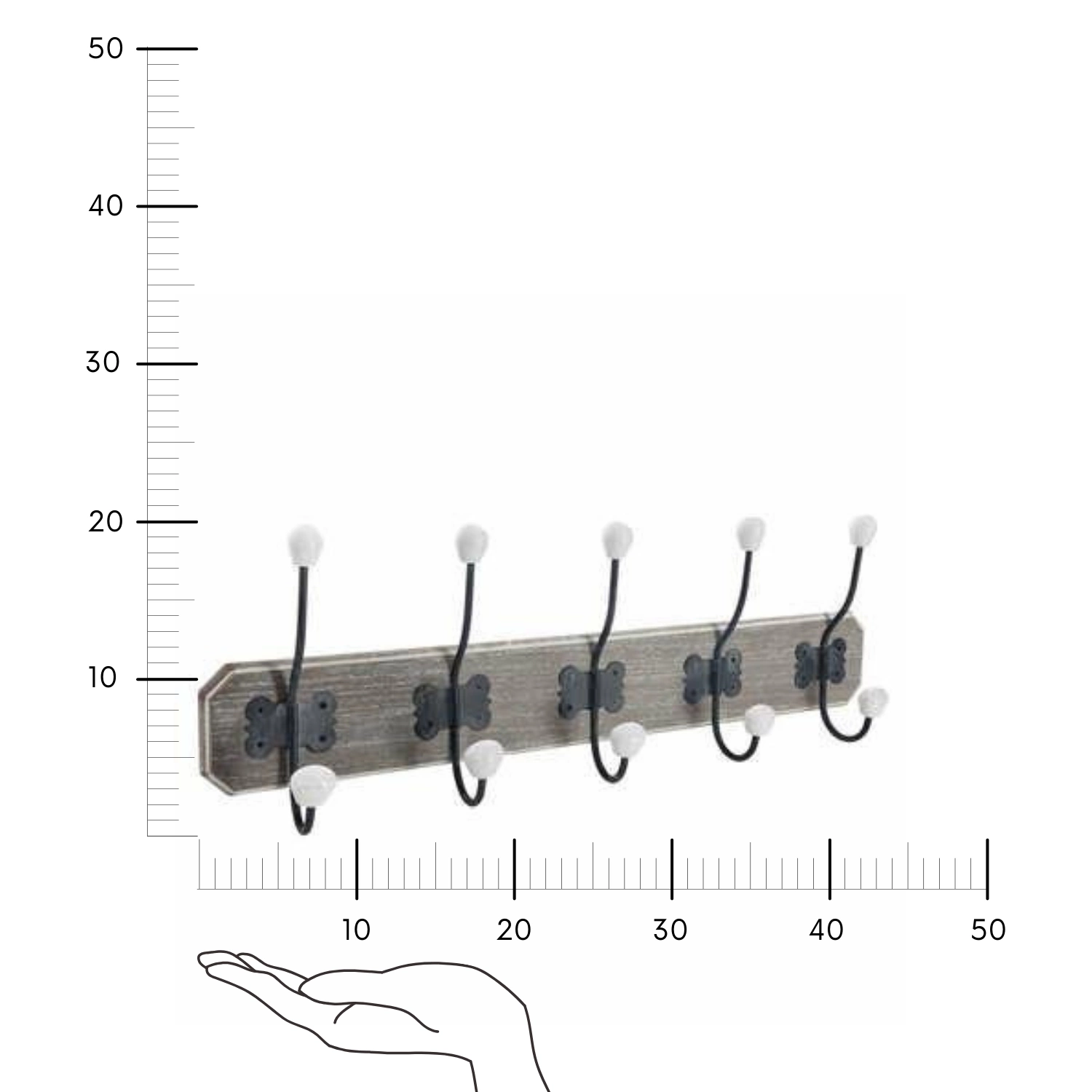 Dzięki pięciu solidnym haczykom wieszak Ruben pozwala wygodnie odwiesić kurtki, płaszcze, torby czy akcesoria codziennego użytku. Wysokość 20 cm ułatwia montaż na dowolnej wysokości, dostosowując się do indywidualnych potrzeb domowników – także dzieci. Lekka konstrukcja (tylko 0,75 kg) gwarantuje łatwe i szybkie zawieszenie na ścianie bez zbędnych komplikacji. Model ten jest również idealny jako wieszak na klucze lub element dekoracyjny, który wprowadzi ład i harmonię do Twojego wnętrza.