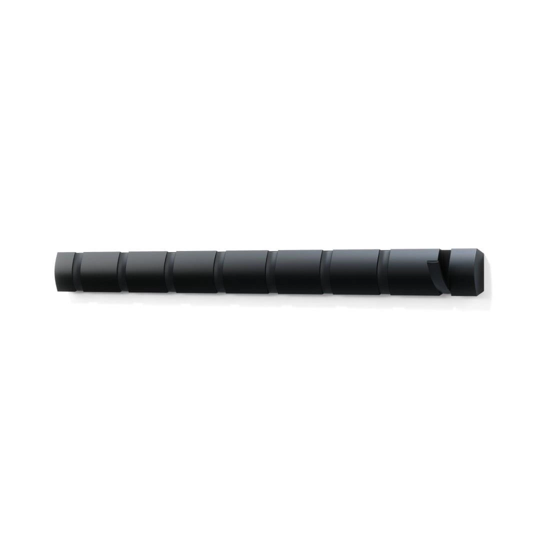 Czarny wieszak na ubrania Umbra Flip to 8-hakowy wieszak wykonany z drewna jesionowego z wysuwanymi hakami. Gdy nie jest używany, wystarczy jednym ruchem złożyć hak do góry. Osprzęt montażowy jest ukryty, co nadaje mu elegancki profil. Maksymalne obciążenie na jeden haczyk to 2,3 kg.