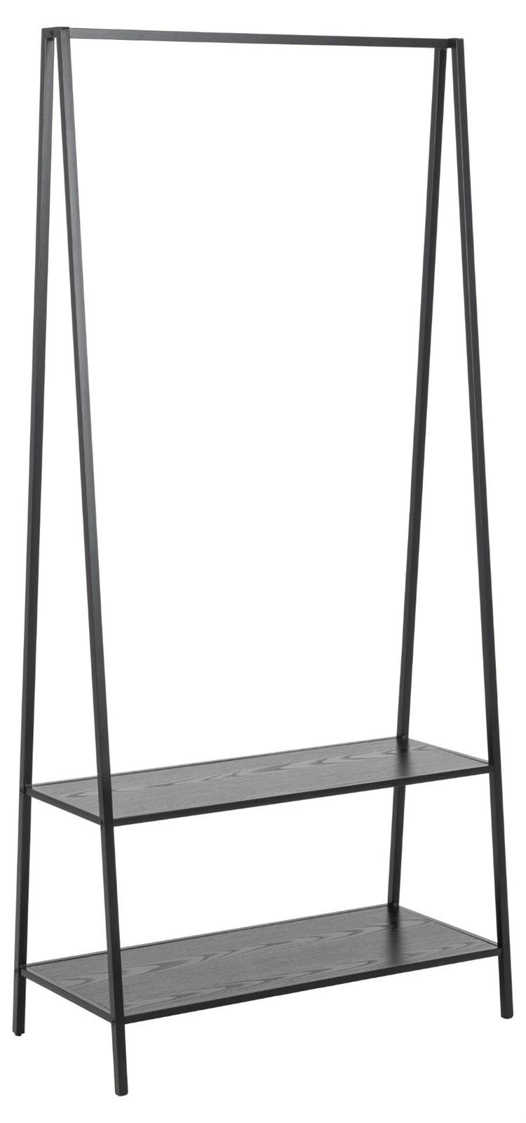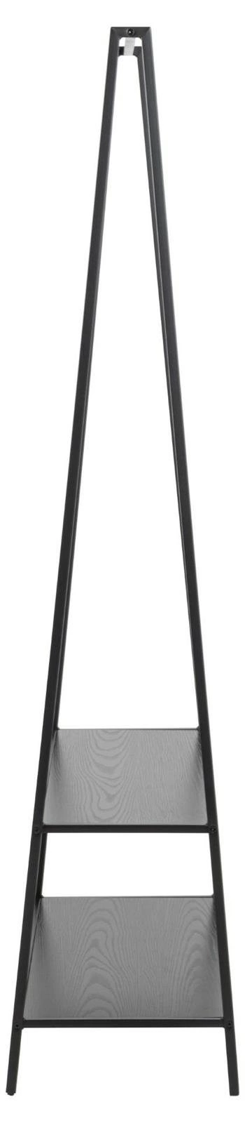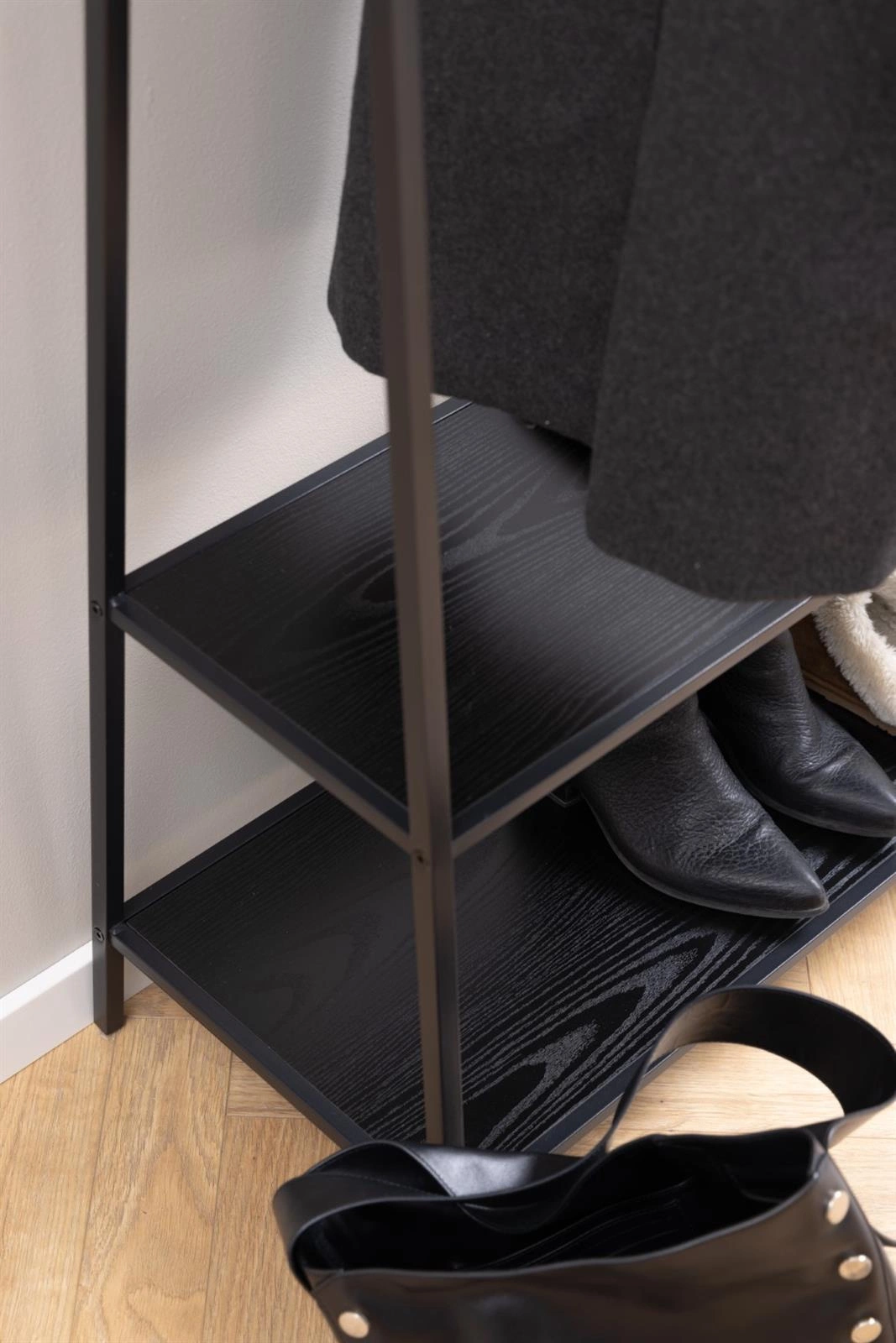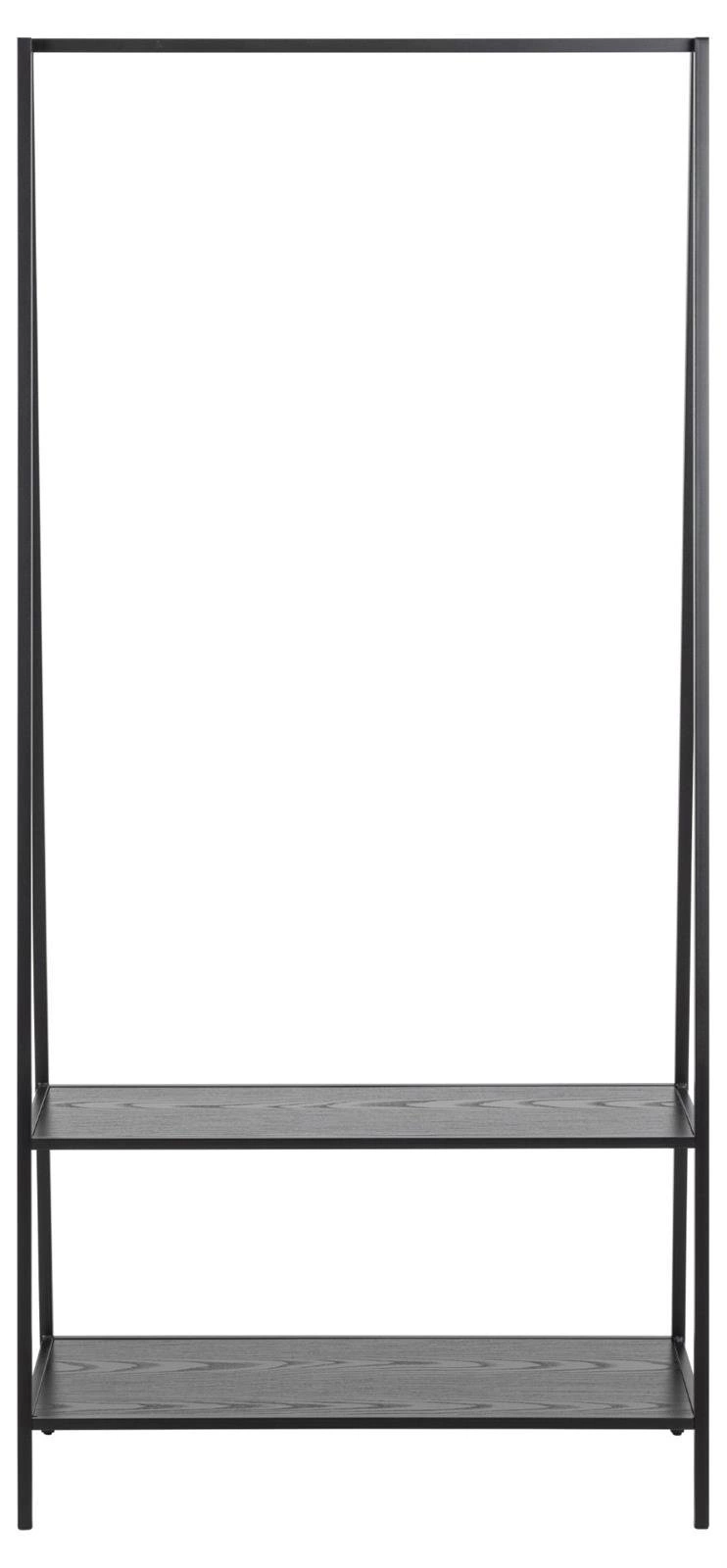 Wieszak Seaford posiada metalowy szkielet malowany proszkowo na czarno. W jego dolnej części znajdują się dwie szerokie półki z płyty MDF oklejone laminatem w tym samym kolorze. Na półkach z powodzeniem można przechowywać buty. W górnej części wieszak posiada umieszczoną w poprzek metalową rurkę, na której zawiesić można nawet duże elementy odzieży tj. kurtki czy długie sukienki. Seaford posiada delikatną, ale stabilną konstrukcję.
