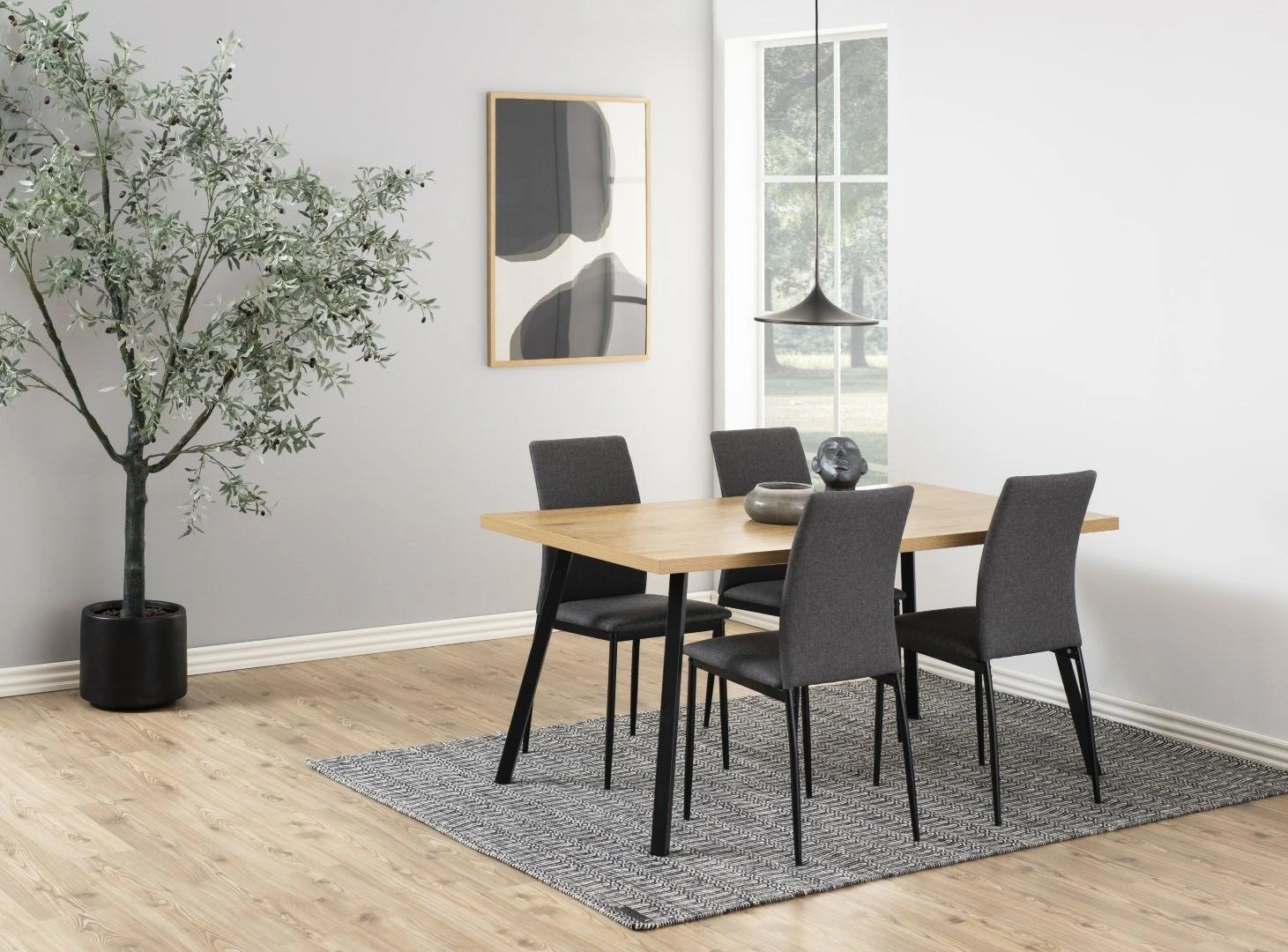 Krzesło Demina to krzesło, które doskonale sprawdzi się w przestrzeni hotelowej, komercyjnej czy domowej. Prosta forma krzesła sprawia, że krzesło dopasuje się do każdego stylu we wnętrzu. Siedzisko zostało obite mocną tkaniną Sawana fabric grey 5, nogi natomiast wykonane zostały z metalu pomalowanego proszkowo na czarno. Krzesło ma prostą i smukłą budowę, dzięki czemu dopasuje się do każdego nawet najbardziej nietypowego stołu. Krzesło jest niebywale lekkie i waży 4,8 kg. Maksymalne obciążenie: 120 kg