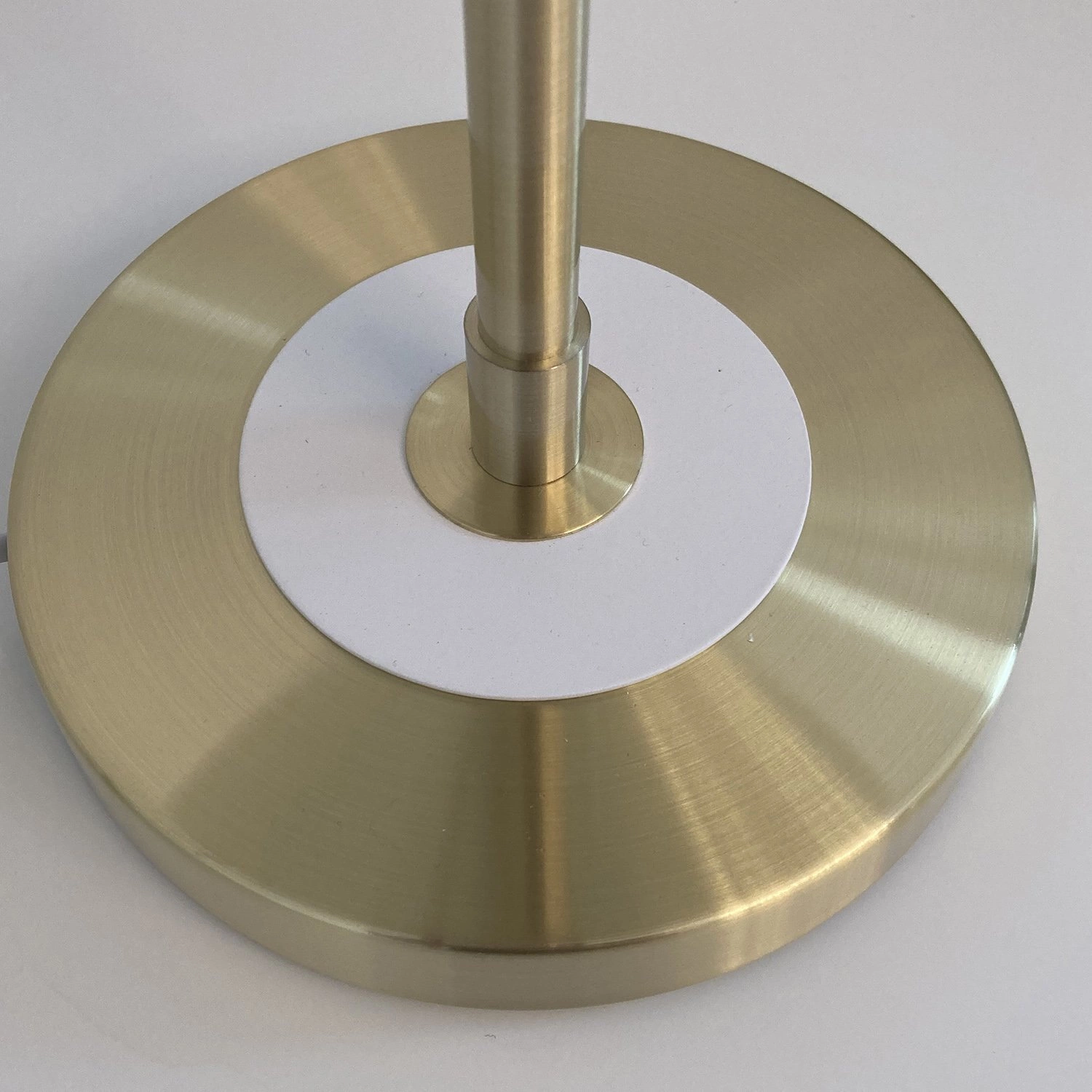 Stylowa i stabilna podstawa lampy ozdobiona jest kołem w kolorze białym.