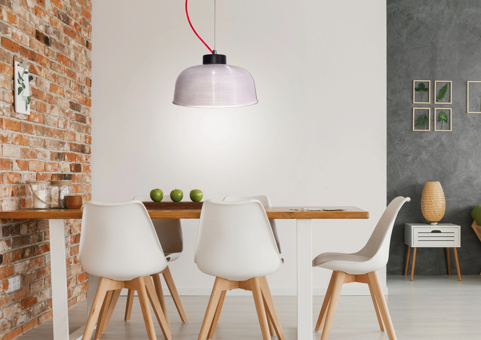 Seria czterech lamp wiszących z ryflowanym kloszem, inspirowanych stylistyką lat 70. Lampy występują w dwóch świetnicach klosza i dwóch kolorach kabla. Idealnie pasują do klasycznych i eklektycznych wnętrz, do pomieszczeń takich jak salon, kuchnia, jadalnia, sypialnia gabinet, przedpokój. Lampa wisząca o średnicy 27 cm z czerwonym kablem i jednym punktem świetlnym. Żarówka nie jest dołączana dla produktów z zewnętrznym źródłem światła.