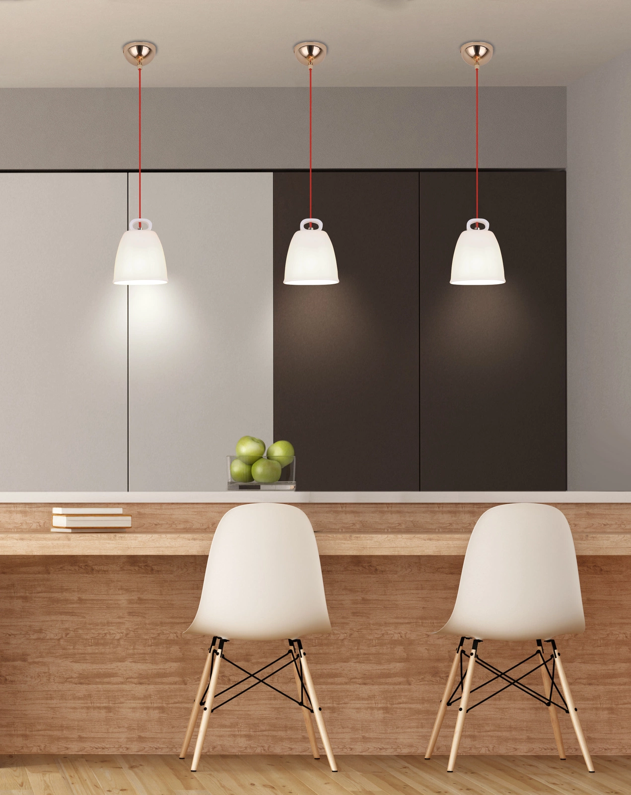 Rodzina czterech lamp wiszących z ceramicznym kloszem w kształcie dzwonka w czterech pastelowych kolorach. Dzięki oryginalnej stylistyce lampy świetnie będą się prezentować w nowoczesnych i eklektycznych wnętrzach. Doskonale komponują się w takch pomieszczeniach jak salon, jadalnia, sypialnia, gabinet oraz pokój dziecięcy. Lampa widząca w kolorze białym z jednym punktem świetlnym. Żarówka nie jest dołączana dla produktów z zewnętrznym źródłem światła.