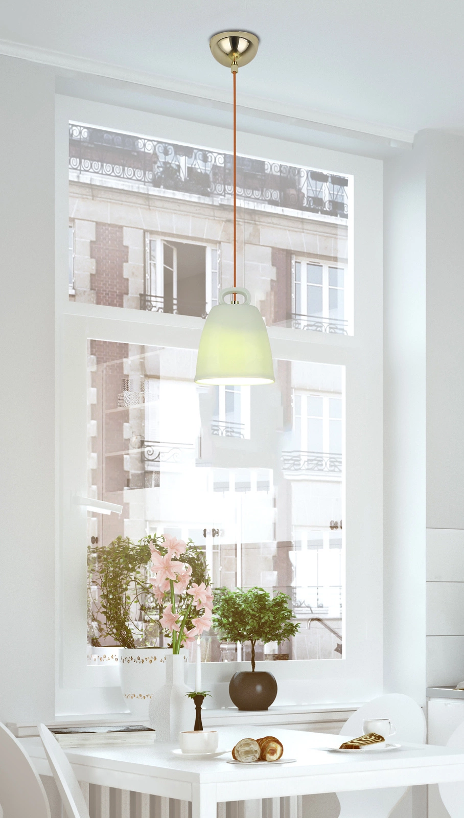 Rodzina czterech lamp wiszących z ceramicznym kloszem w kształcie dzwonka w czterech pastelowych kolorach. Dzięki oryginalnej stylistyce lampy świetnie będą się prezentować w nowoczesnych i eklektycznych wnętrzach. Doskonale komponują się w takch pomieszczeniach jak salon, jadalnia, sypialnia, gabinet oraz pokój dziecięcy. Lampa widząca w kolorze zielonym z jednym punktem świetlnym. Żarówka nie jest dołączana dla produktów z zewnętrznym źródłem światła.