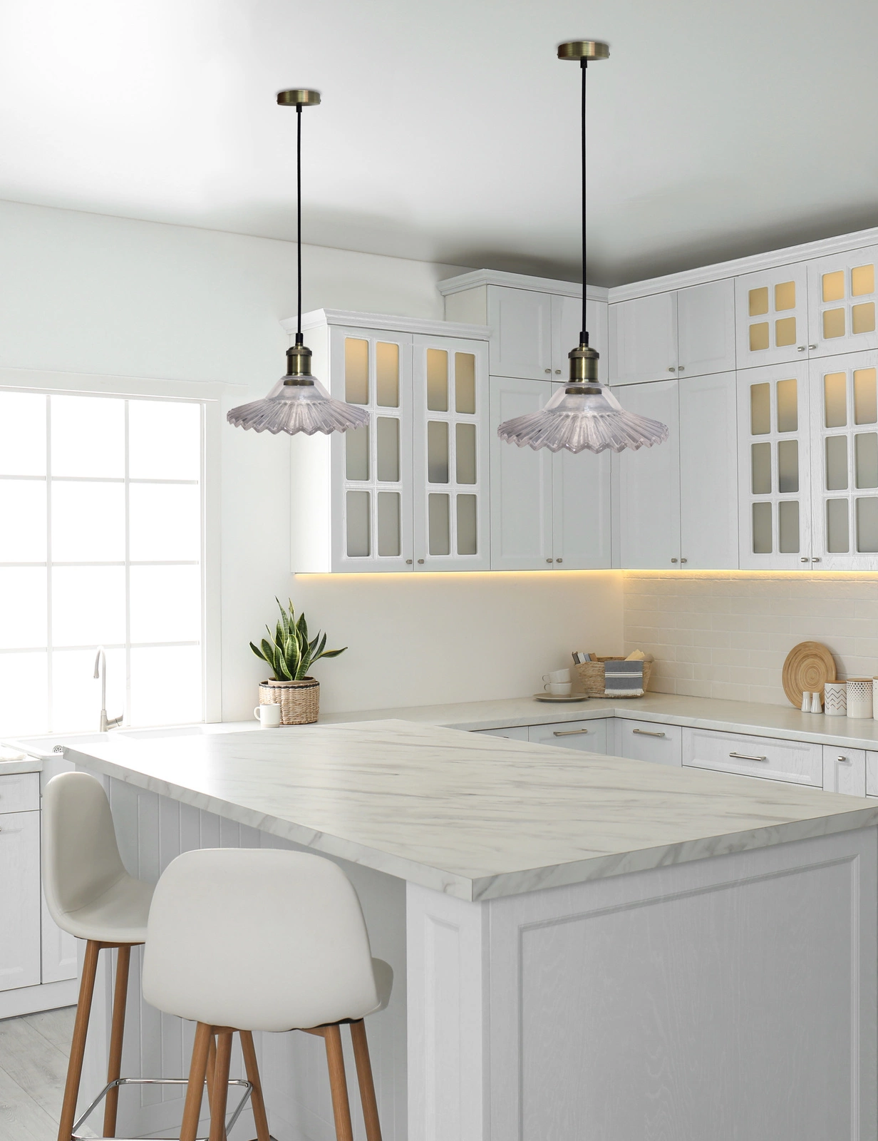 Seria lamp w dwóch kolorach inspirowananych stylem Art Deco ze szklanym ryflowanym kloszem. Lampy pasują do klasycznych wnętrz, do pomieszczeń takich jak salon, kuchnia, jadalnia, sypialnia, gabinet. Lampa wisząca o średnicy 21 cm z przeźroczystym kloszem i jednym punktem świetlnym. Żarówka nie jest dołączana dla produktów z zewnętrznym źródłem światła.