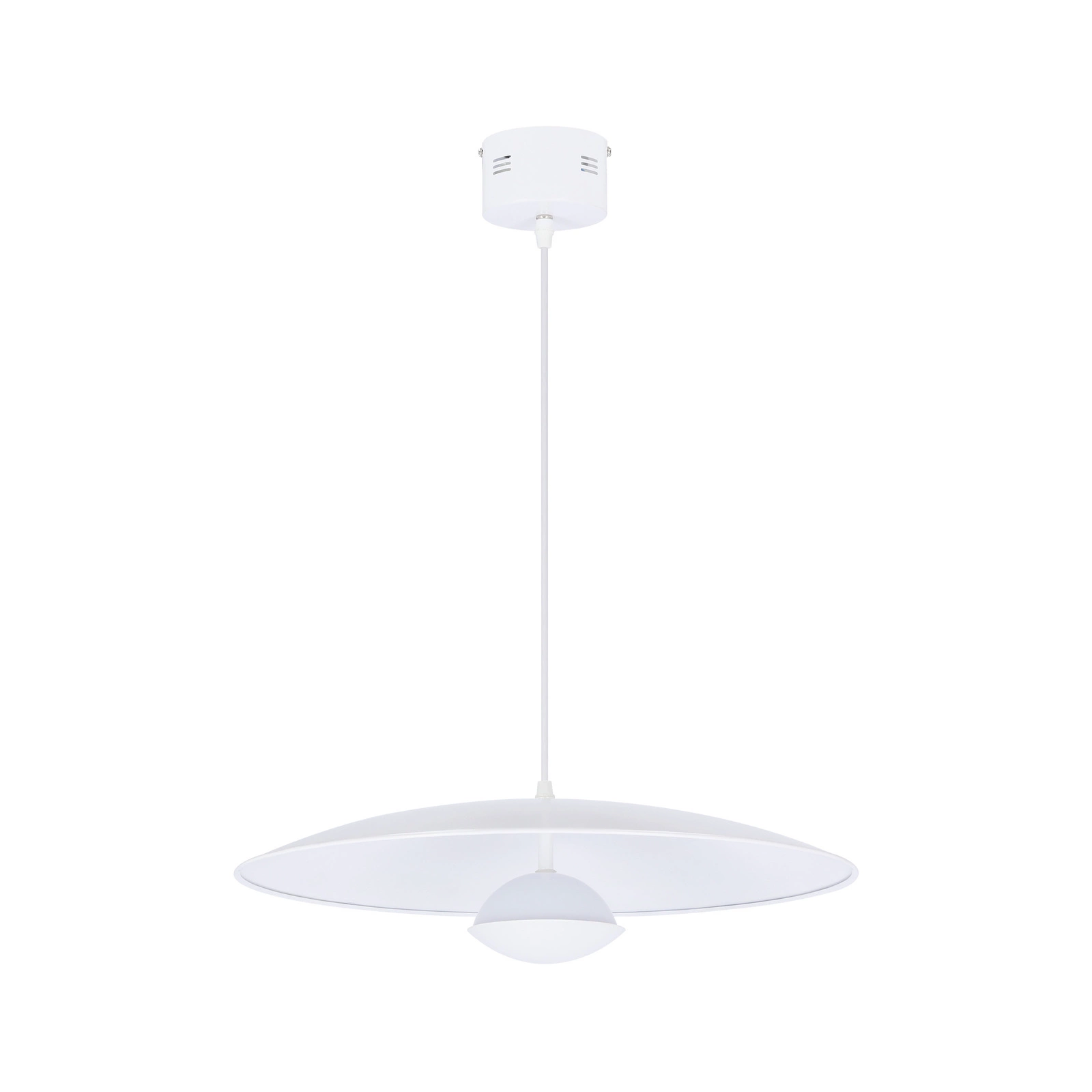 Seria czterech lamp o nowoczesnym kształcie insporowane stylistyką skandynawską. Eleganckie lampy wykonane z białego metalu ze zintegrowanym źródłem światła LED o ciepłej barwie. Doskonale nadają się do salonu, jadalni, kuchni, gabinetu oraz sypialni. Lampa wisząca o średnicy 48 cm.