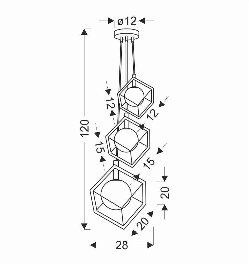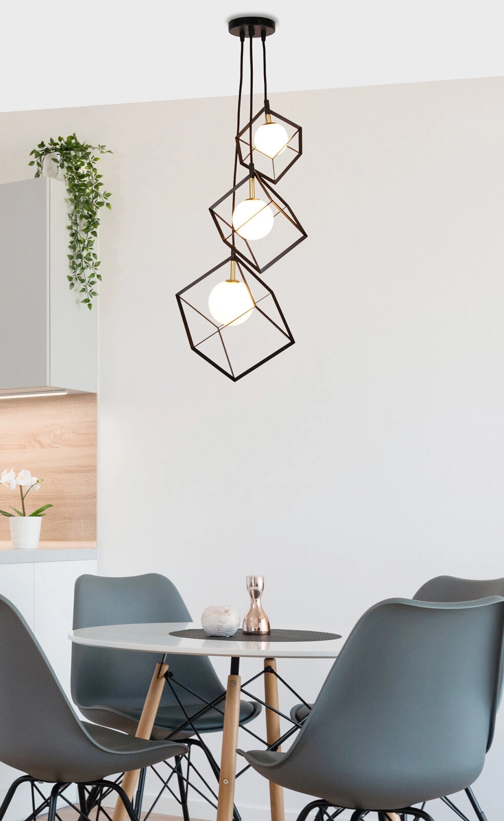 Seria lamp inspirowanych stylem industrialnym w kształcie kostki, wykonanych z metalu w kolorach czarnym i złotym, z białym szklanym kloszem wewnątrz. W skład rodziny wchodzą 3 lampy wiszące i dwie lampy stołowe. Doskonale nadają się do salonu, kuchni, jadalni, gabinetu, sypialni, pokoju młodzieżowego. Rodzina lamp sprawdzi się również w pomieszczeniach użyteczności publicznej typu salony piekności, kawiarnie, puby, itp.Seria składa się lamp pojedyńczych i potrójnych w różnych wielkościach, co daje możliwość ciekawego zestawiania lamp w pomieszczeniu. Lampa wisząca potrójna złożona z trzech wielkości kostek z trzema źródłami światła. Żarówki nie są dołączone do produktów z zewnętrznym źródłem światła.