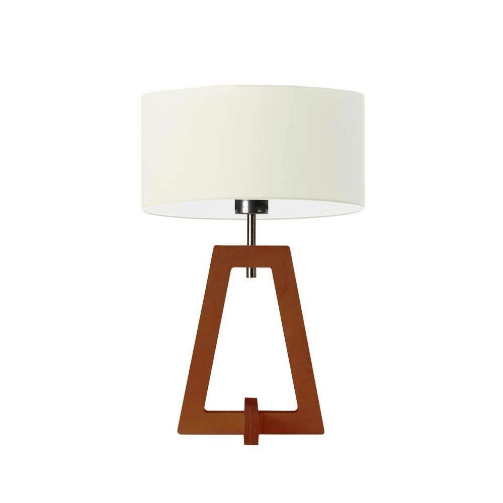 Lampa Clio wyróżnia się ciekawą konstrukcją, tworzoną przez podstawę w kształcie trapezu i tkaninowy abażur.