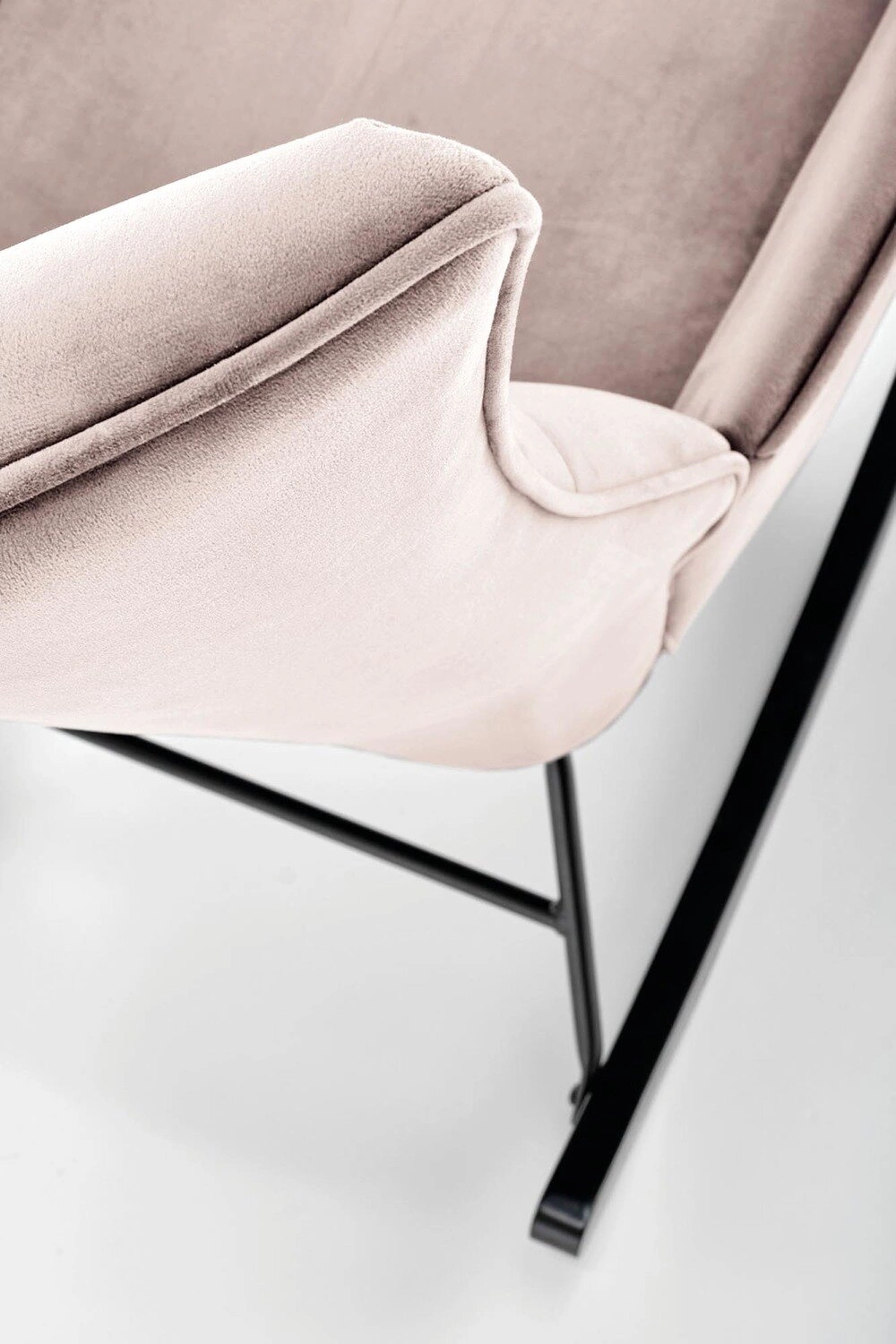 Fotel bujany Topar to idealny mebel dla tych, którzy pragną dodać swojemu wnętrzu nutę nowoczesności i skandynawskiego stylu. Tapicerowany przyjemną w dotyku tkaniną welurową, fotel oferuje wyjątkowy komfort i elegancję. Jego solidna podstawa z metalowymi biegunami zapewnia nie tylko stabilność, ale również delikatne bujanie, które sprzyja relaksowi.